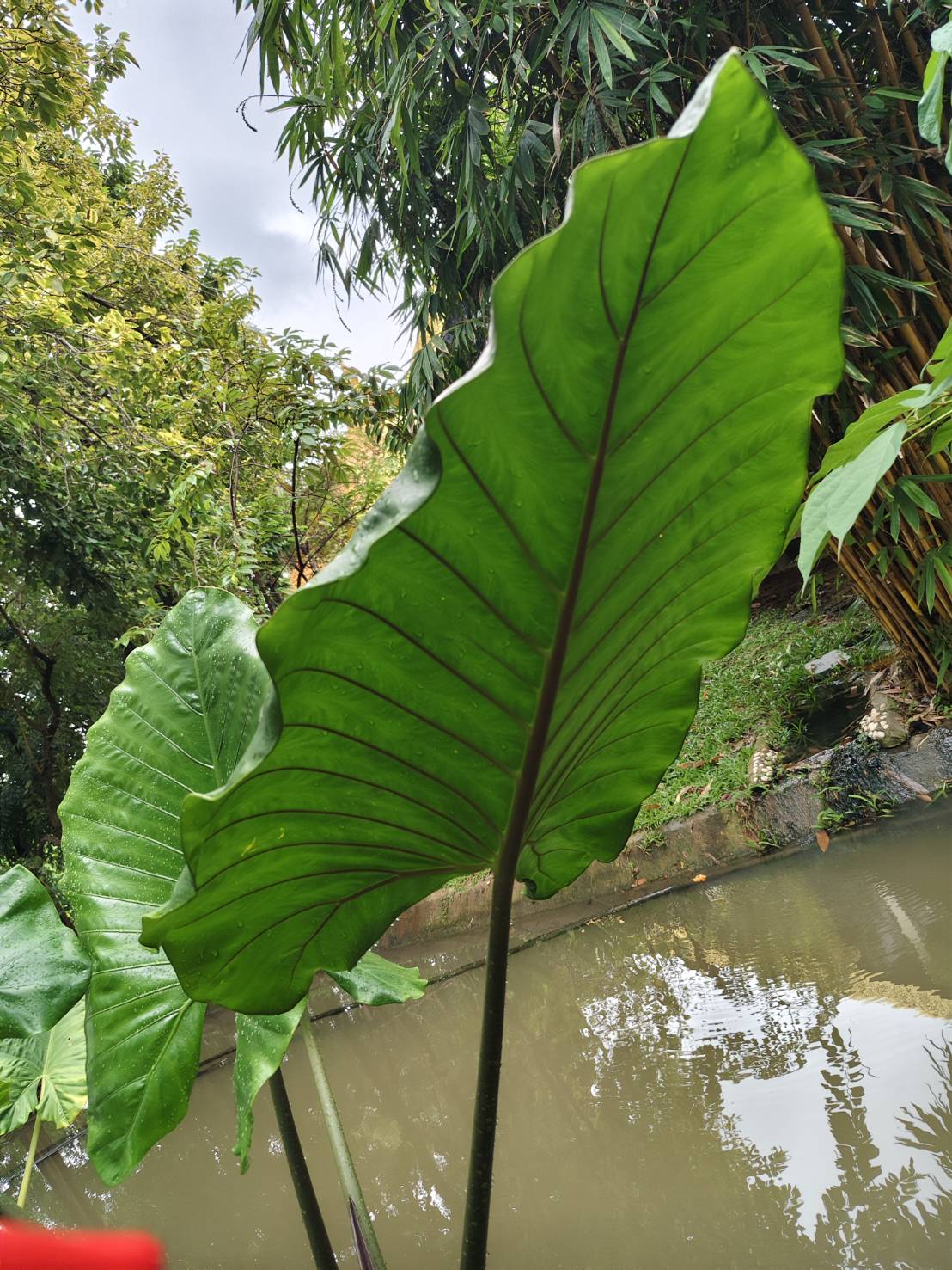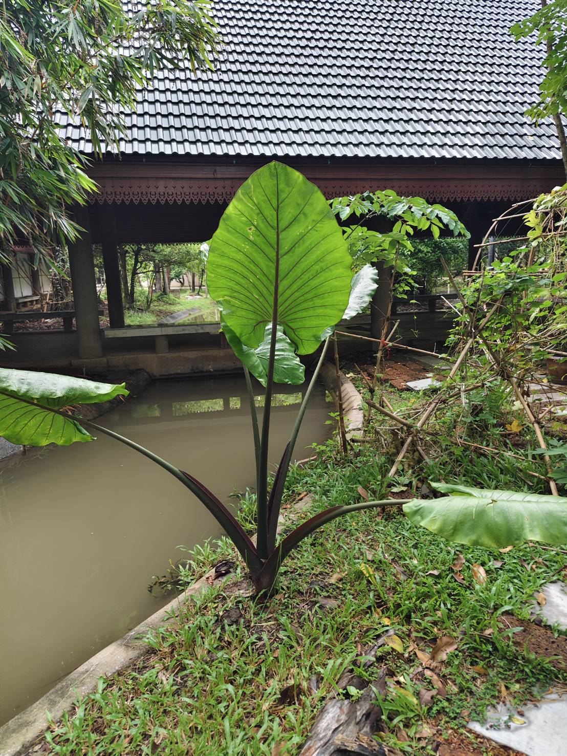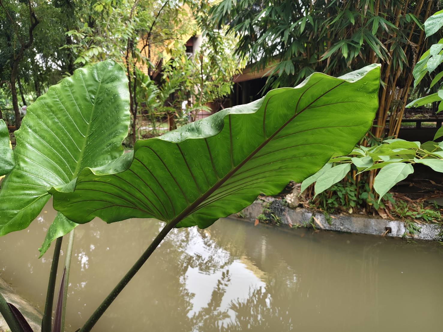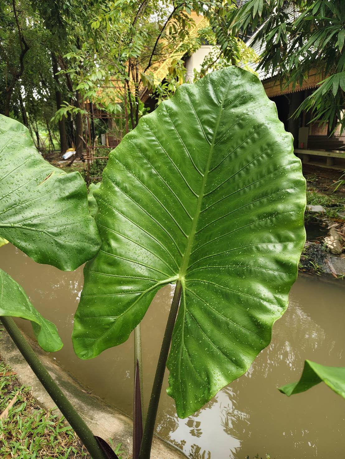 | ลักษณะใบ | ใบเดี่ยว รูปไข่แกมรูปหัวใจ กว้าง 20-40 เซนติเมตร ยาว 30-75 เซนติเมตร ปลายแหลม โคนเว้าลึก ขอบเรียบหรือเป็นคลื่น เส้นแขนงใบข้างละ 5-7 เส้น ก้านใบใหญ่ ยาว 0.4-1.2 เมตร |