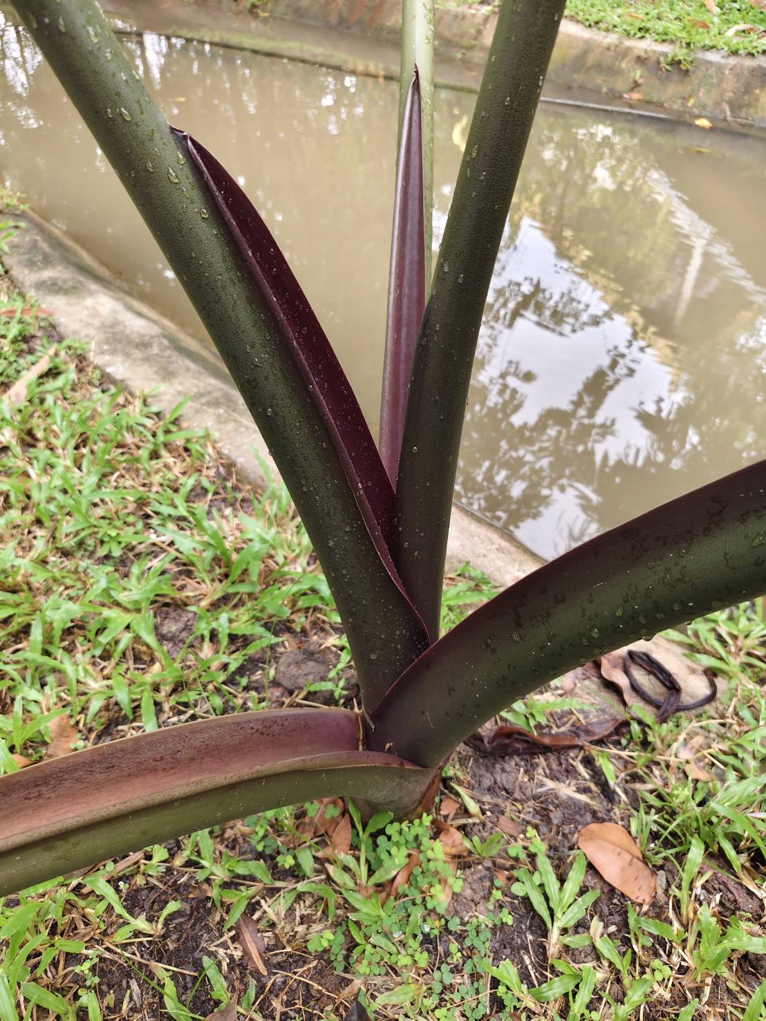 | ลักษณะวิสัย | เป็นไม้ล้มลุกเนื้ออ่อนจำพวกบอน มีเหง้าทอดไปตามพื้นดิน ลำต้นมีลักษณะคล้ายบอน กาบใหญ่ ยาวกว่าบอน ต้นกลมโตสูงจากพื้นดินเล็กน้อย สีของกาบมีสีแดงเข้มจวนดำ เป็นไม้ลงหัว |