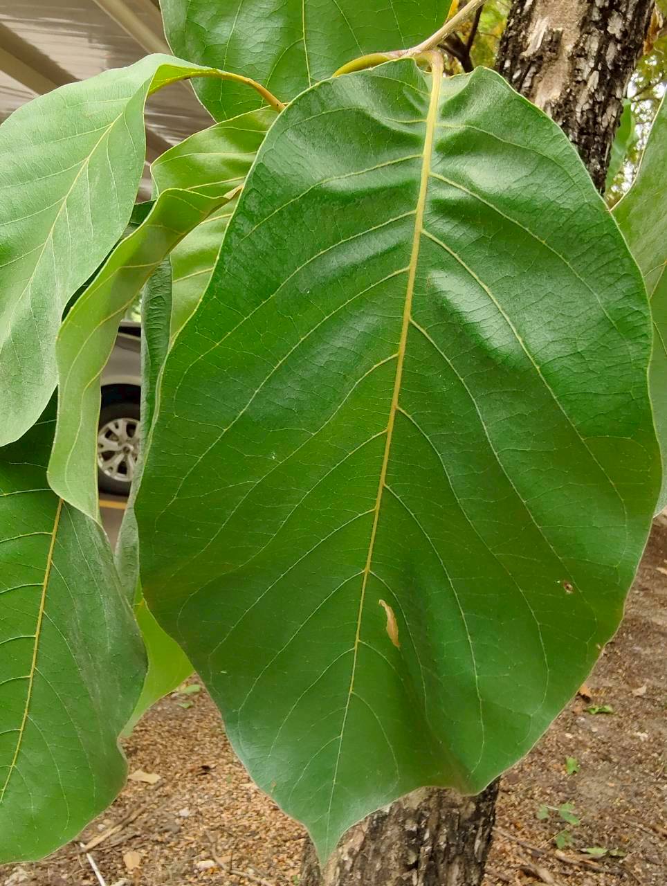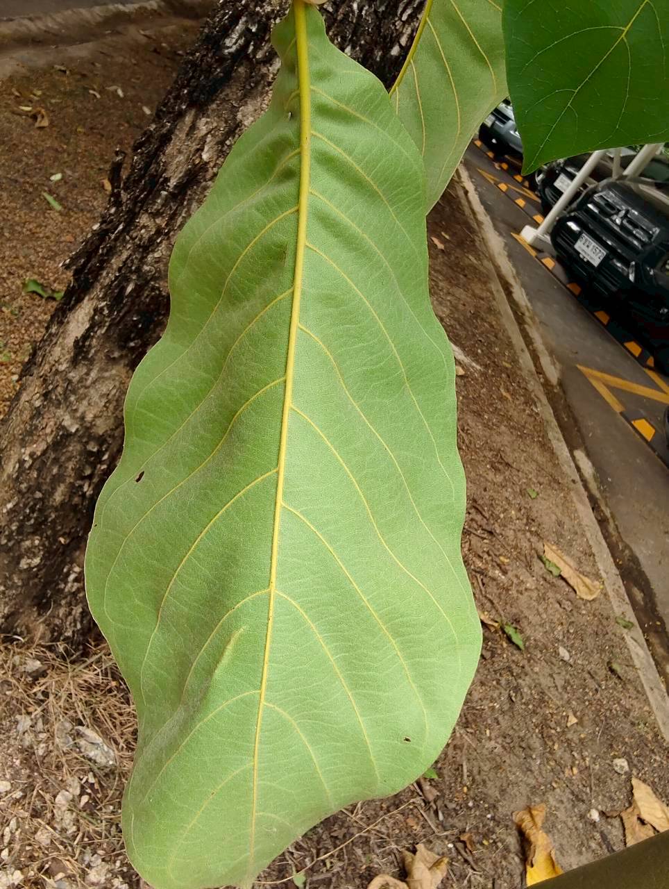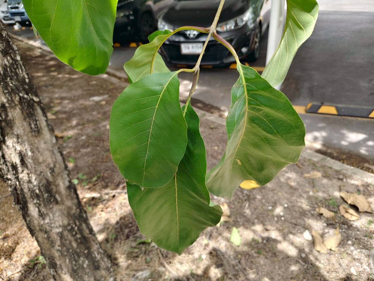 | ลักษณะใบ | ใบเป็นใบเดี่ยว เรียงเยื้องสลับข้างกันบริเวณปลายของกิ่งแขนง ก้านใบยาว 1.5-2.5 เซนติเมตร ใบรูปร่างรี โคนใบและปลายใบมน ด้านบนมีสีเขียวเข้ม ใบด้านล่างสีจางกว่า แผ่นใบค่อนข้างหนา เรียบ มีขนขึ้นปกคลุม |