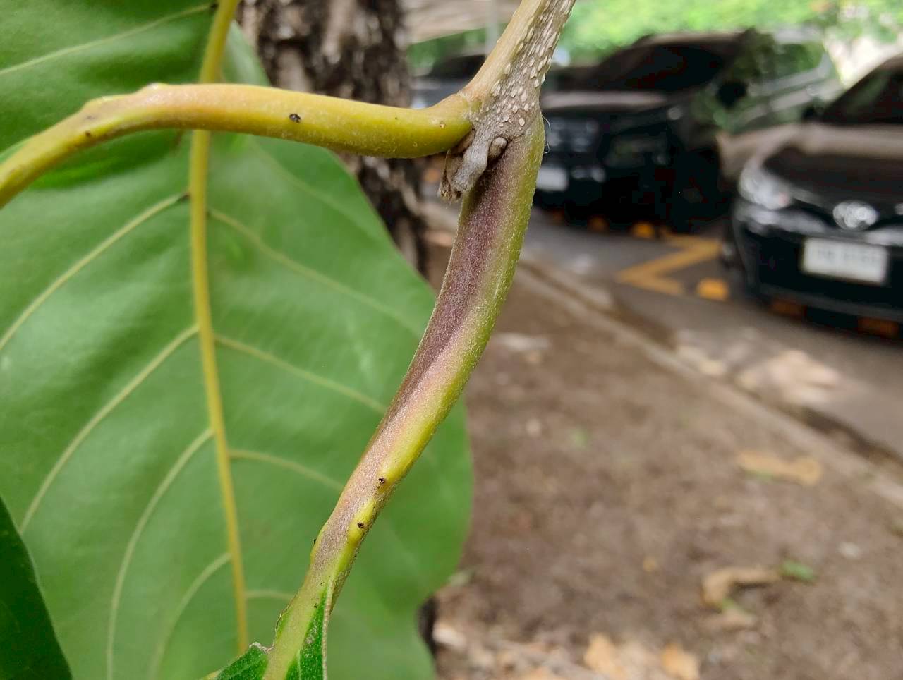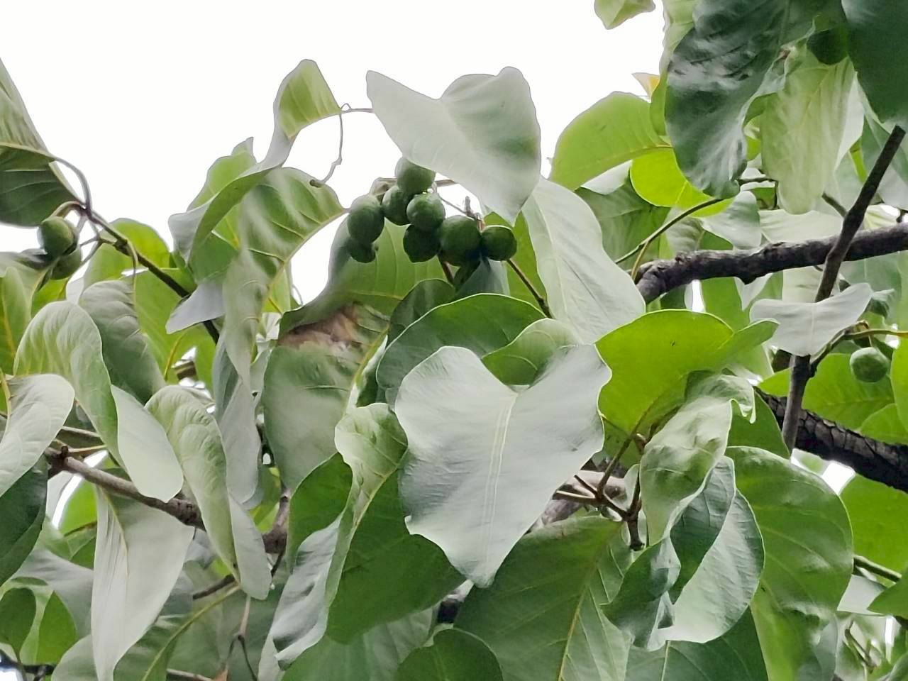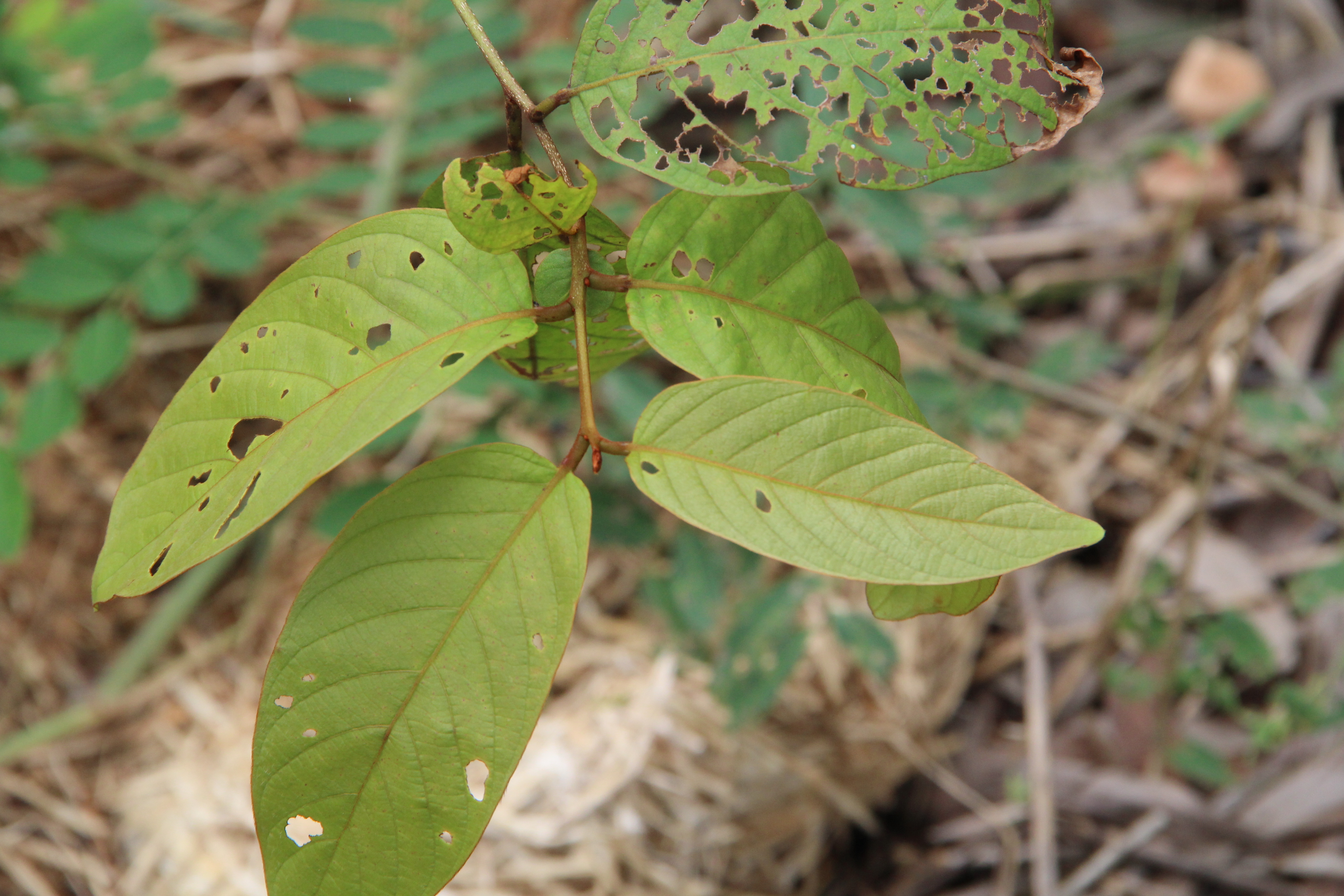 | ลักษณะใบ | ใบเป็นใบเดี่ยว เรียงเยื้องสลับข้างกันบริเวณปลายของกิ่งแขนง ก้านใบยาว 1.5-2.5 เซนติเมตร ใบรูปร่างรี โคนใบและปลายใบมน ด้านบนมีสีเขียวเข้ม ใบด้านล่างสีจางกว่า แผ่นใบค่อนข้างหนา เรียบ มีขนขึ้นปกคลุม |