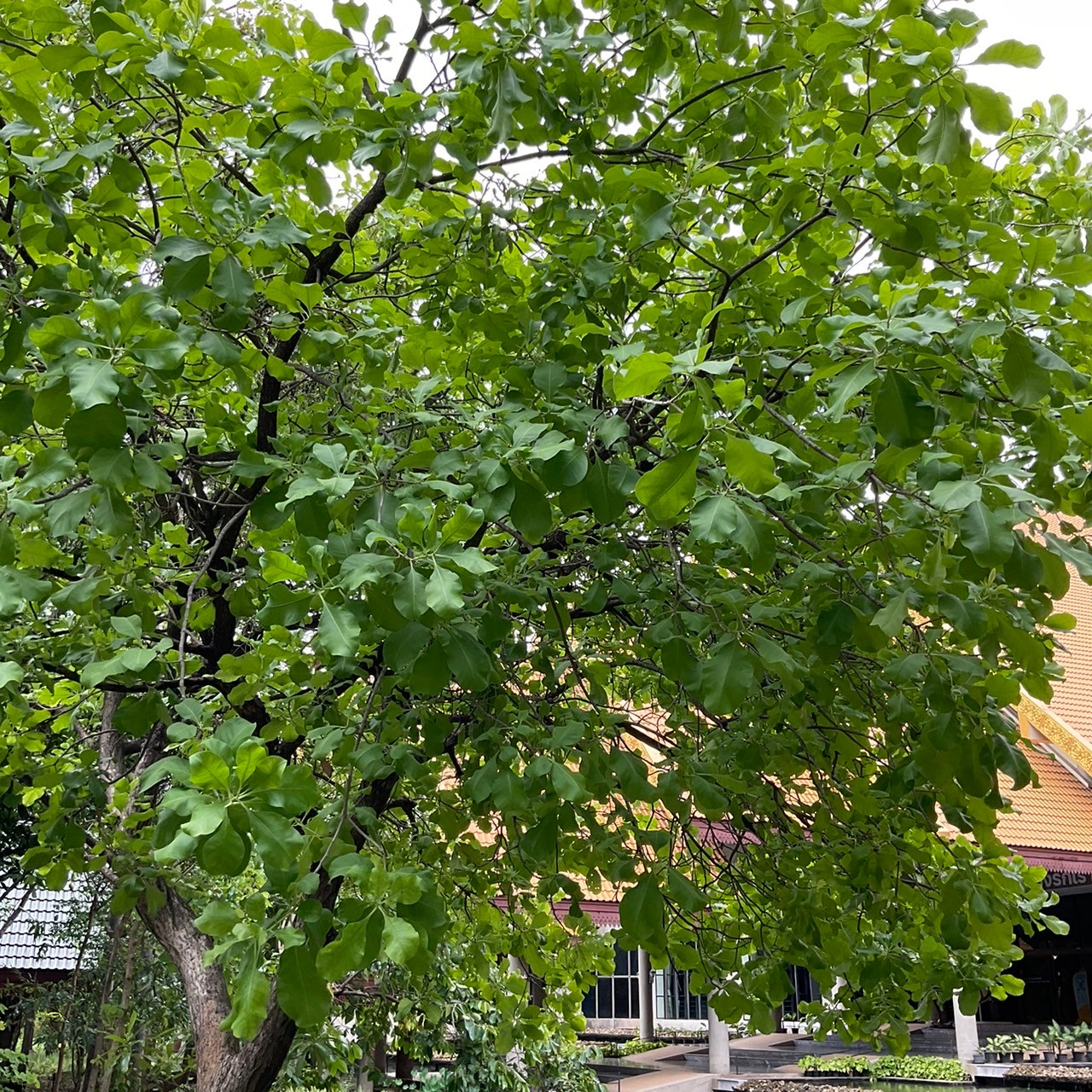 | ลักษณะใบ | ใบเป็นใบเดี่ยว เรียงสลับเวียนเป็นกลุ่มตามปลายกิ่ง รูปไข่กลับ กว้าง 15-25 เซนติเมตร ยาว 30-35 เซนติเมตร ปลายใบมน มีติ่งแหลมยื่น ฐานใบสอบเรียว ขอบใบหยักเล็กน้อยตลอดทั้งขอบใบ ผิวใบทั้ง 2 ด้านเกลี้ยง เนื้อใบหนา ค่อนข้างนิ่ม ก้านใบอวบ ยาว 2-3 เซนติเมตร หน้าแล้วใบแก่ท้องใบจะเป็นสีแดง และทิ้งใบเมื่อออกใบอ่อน |