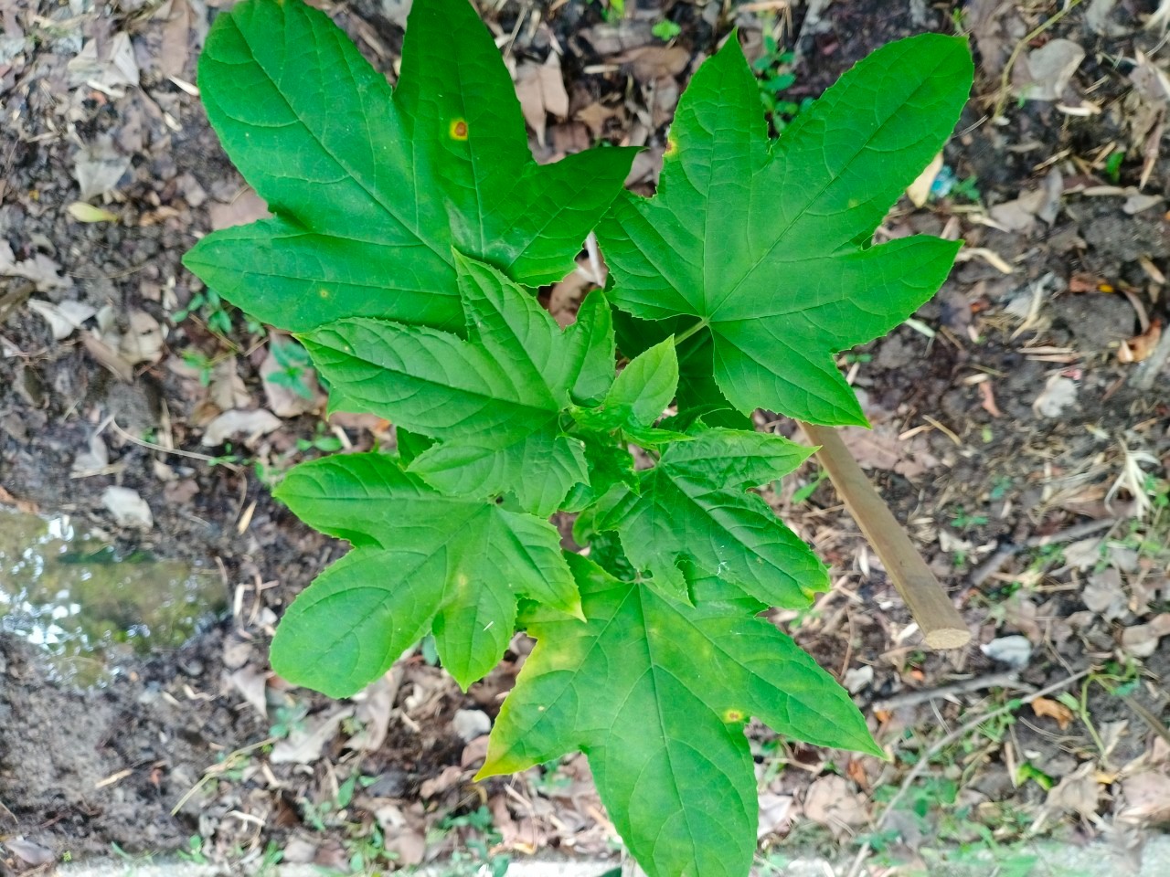 | ลักษณะใบ | ใบเป็นใบเดี่ยวออกเรียงตรงข้ามสลับตั้งฉาก ใบเป็นฝ่ามือรูปไข่กว้างหรือรูปไข่เกือบกลม ใบกว้างประมาณ 7-38 เซนติเมตร ยาวประมาณ 4-40 เซนติเมตร ขอบใบหยักเว้าลึกเป็นแฉก 3-7 แฉก ปลายแฉกจะแหลม ฐานใบเป็นรูปหัวใจ ขอบใบเป็นจักคล้ายฟันเลื่อย ผิวใบมีขน หลังใบมีสีเขียวเข้ม ท้องใบมีขนสากระคายมือ มีสีอ่อนกว่า ก้านใบยาวประมาณ 3-15 เซนติเมตร |