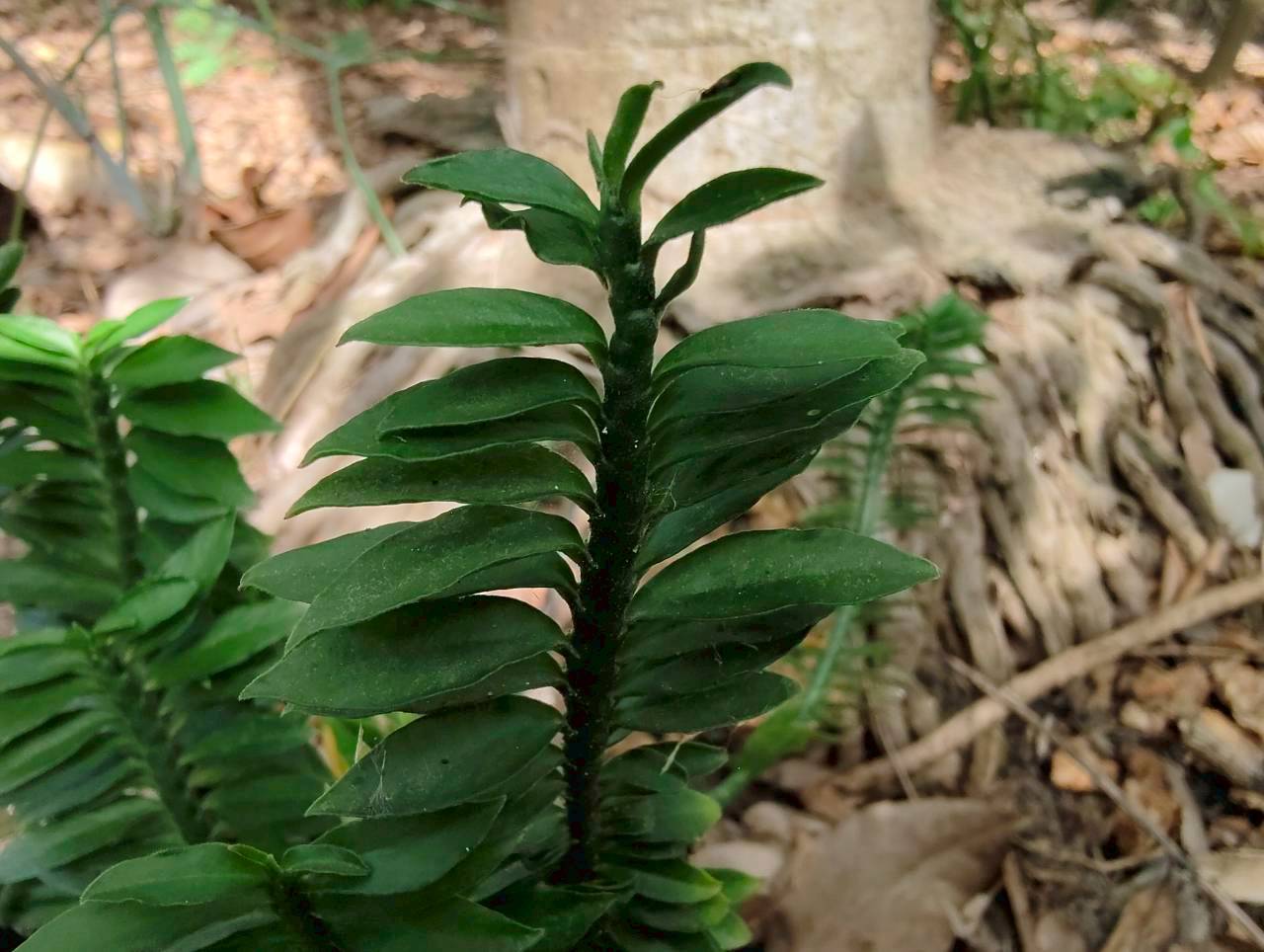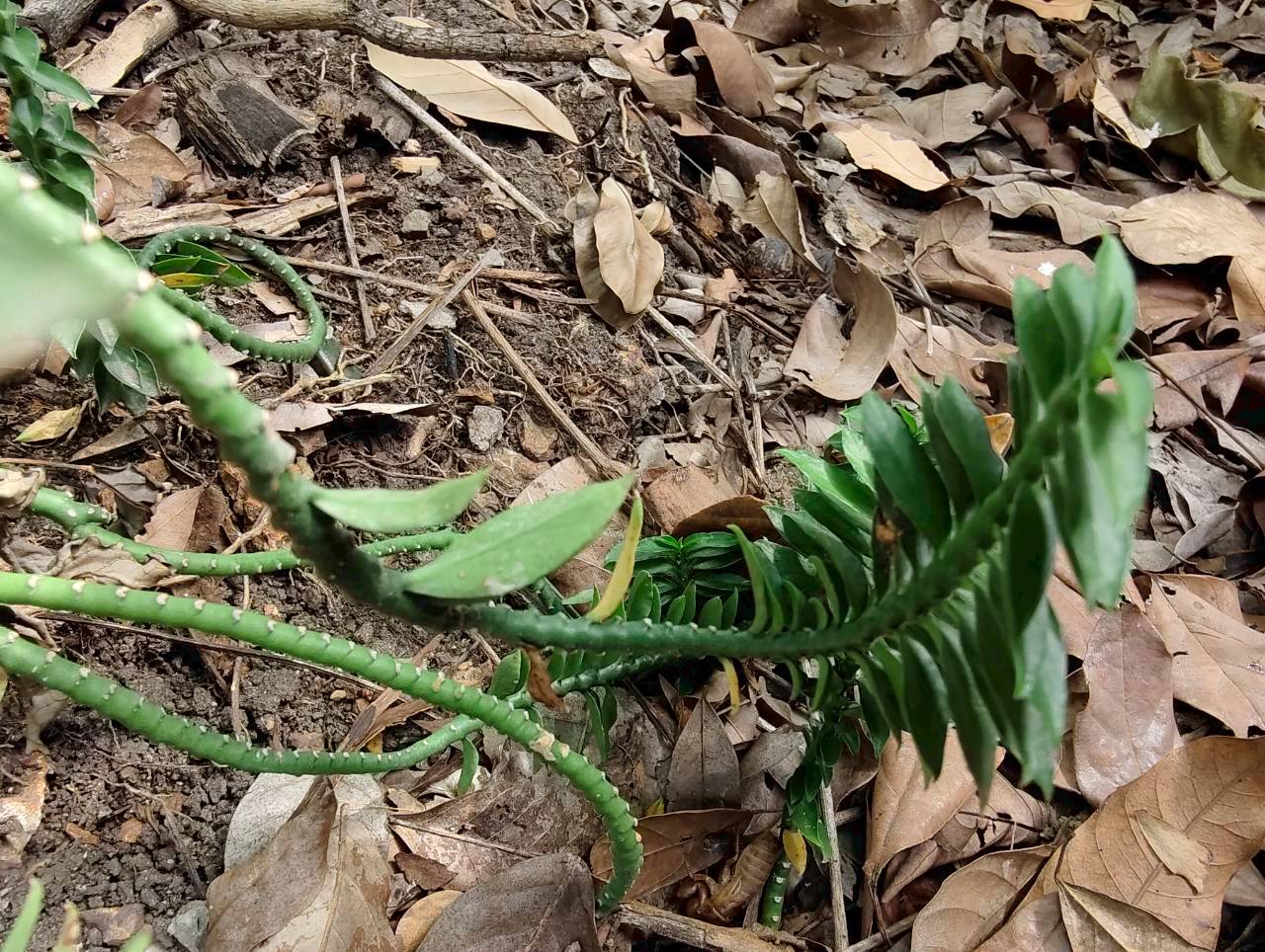 | ลักษณะใบ | ใบรูปรีแกมรูปขอบขนาน กว้างประมาณ 0.5 เซนติเมตร ยาว 2-4 เซนติเมตร ปลายใบแหลม แผ่นใบอวบหนา สีเขียวเข้ม ไม่มีก้านใบ ใบออกติดกันเป็นปีกสองข้าง จากโคนต้นจนถึงยอด ดูคล้ายตะขาย |