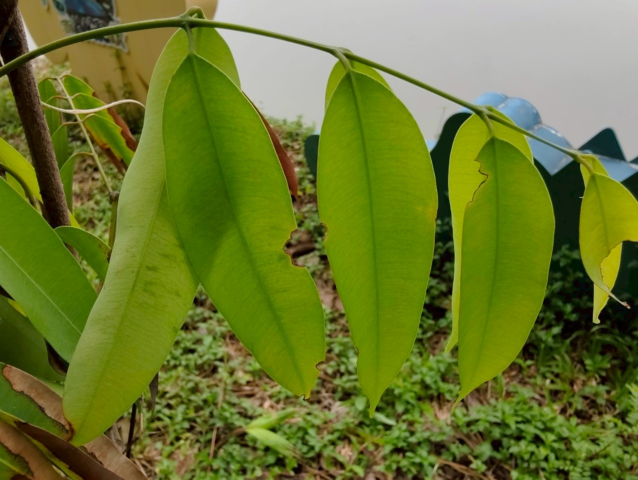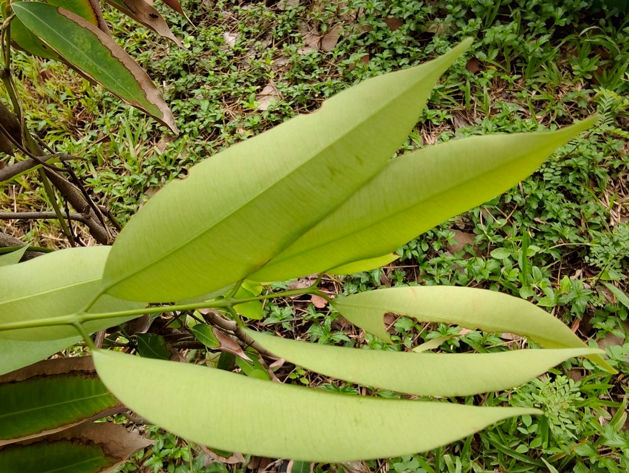 | ลักษณะใบ | ใบเป็นใบเดี่ยว ออกตรงข้ามกัน ใบคล้ายรูปหอกหรือรูปขอบขนานแกมรูปหอก ปลายใบเรียวแหลม คล้ายใบมะปราง โคนใบสอบ แผ่นใบหนา ผิวใบเรียบเกลี้ยง ท้องใบมีคราบขาวปกคลุมอยู่ ใบมีขนาดกว้างประมาณ 1.2-4 เซนติเมตร ยาวประมาณ 5-13 เซนติเมตร ใบอ่อนจะมีสีชมพูออกแดง ส่วนใบแก่ด้านบนมีสีเขียวเข้ม ก้านใบยาวประมาณ 0.8-1.2 เซนติเมตร |