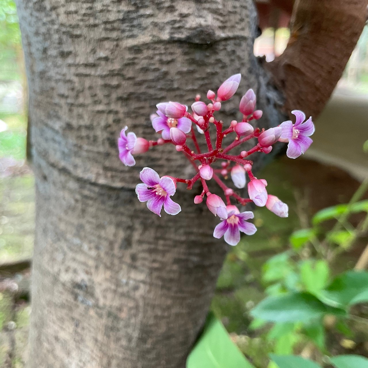 | ลักษณะดอก | ดอกเป็นดอกช่อ มีก้านช่อยาว กลีบดอกสีชมพู ดอกเล็ก มีกลีบเลี้ยงสีม่วงอมแดง มีกลิ่นหอม ดอกแทงออกตามลำต้น ตามกิ่ง และปลายกิ่ง |