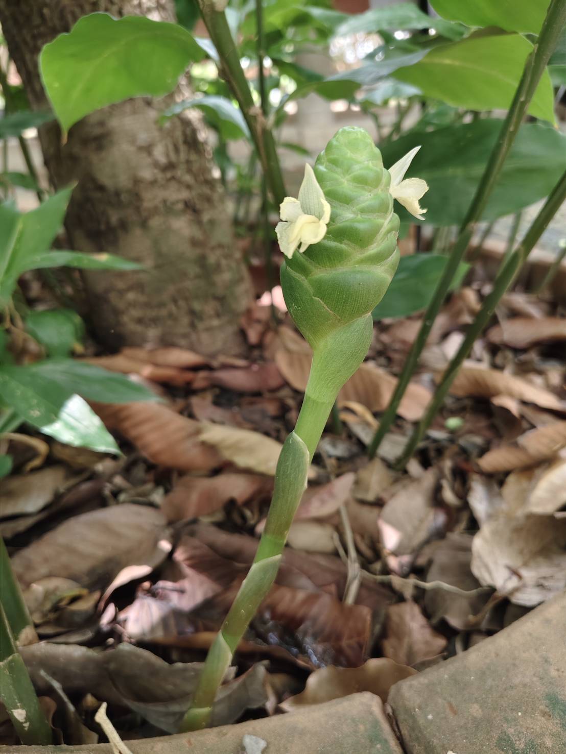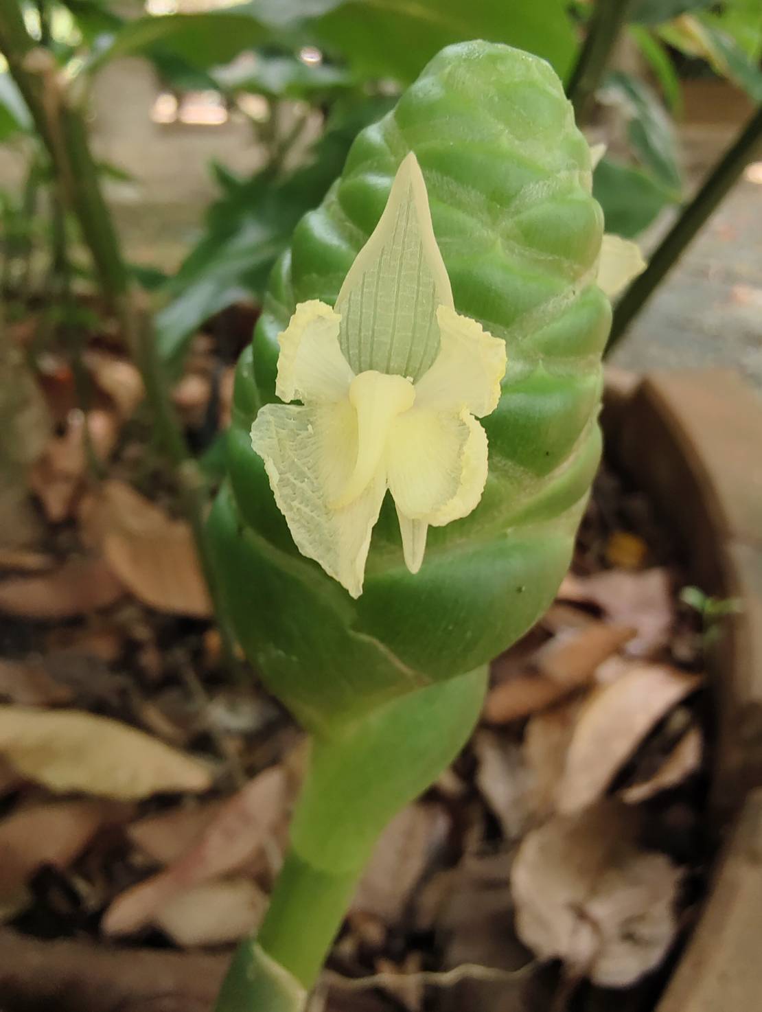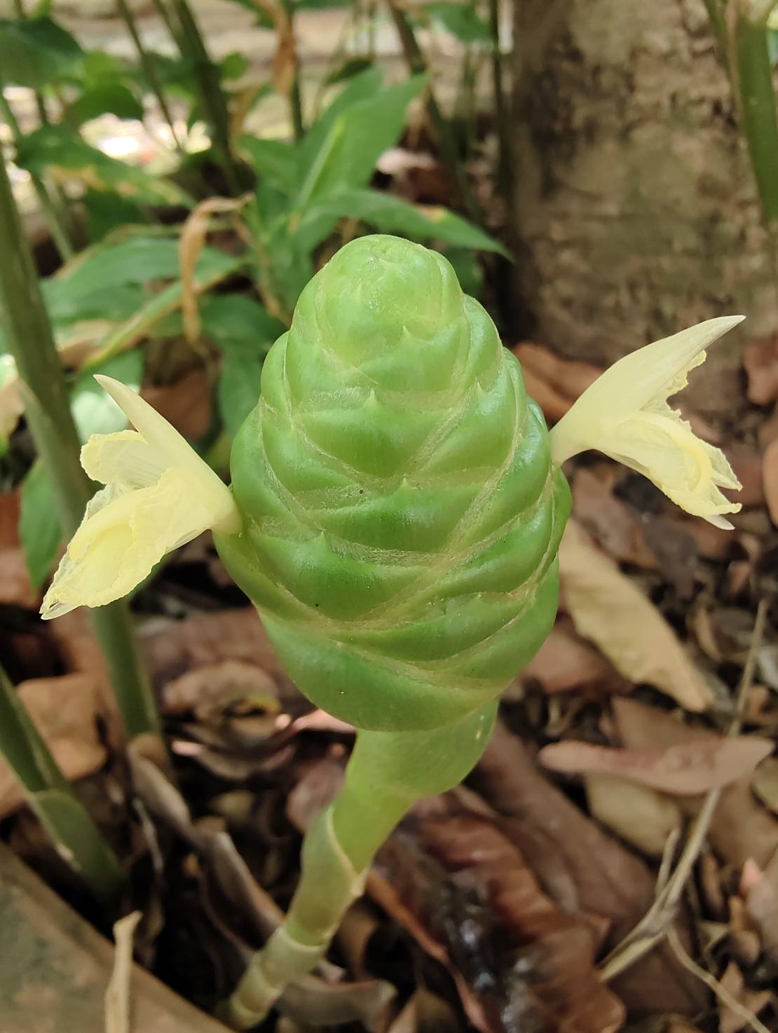 | ลักษณะดอก | ดอกออกเป็นช่อ แทงออกมาจากเหง้า ลักษณะของช่อดอกเป็นรูปทรงกระบอก มีกลีบดอกสีขาวนวลออกเหลือง มีใบประดับขนาดใหญ่สีเขียวแกมแดงเรียงซ้อนกันหนาแน่นและเป็นระเบียบ โคนเชื่อมติดกันเป็นหลอด ดอกจะบานไม่พร้อมกัน |