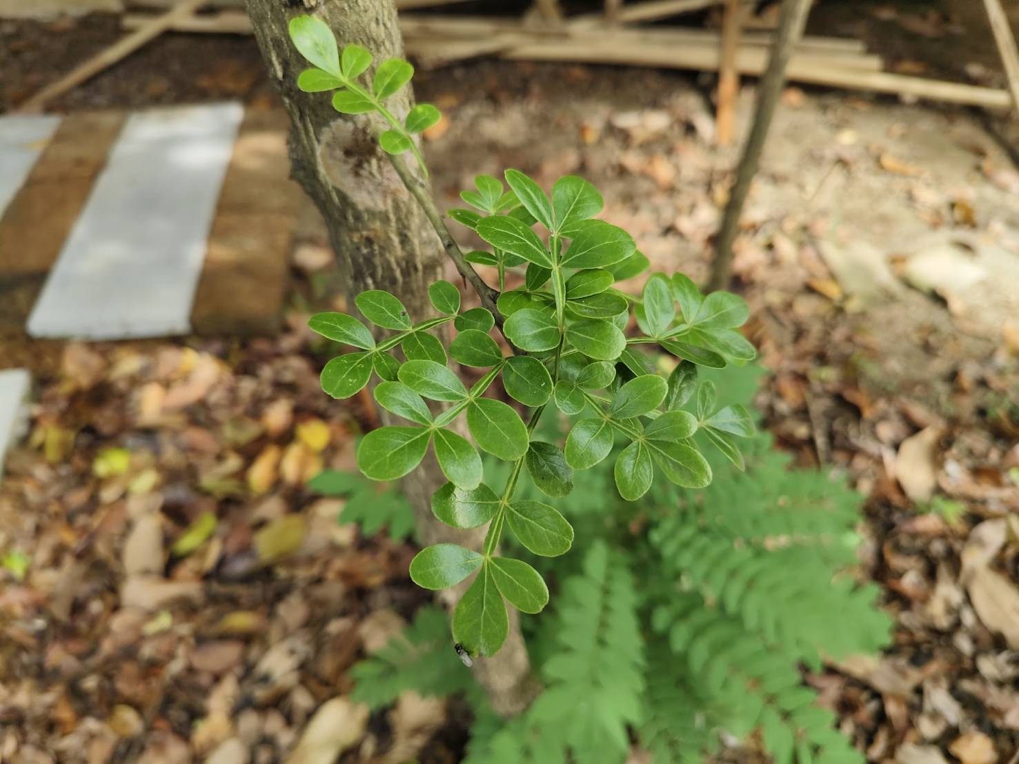 | ลักษณะใบ | ใบเป็นใบประกอบแบบขนนกชั้นเดียวหรือสองชั้น ปลายใบคี่ ก้านใบรวมยาวประมาณ 5-12 เซนติเมตร เรียงตัวกันแบบสลับหรือเป็นกระจุกประมาณ 2-3 ก้านใน 1 ข้อ ใบย่อยเกิดเป็นคู่ๆ เรียงตัวกันแบบตรงข้าม มีจำนวน 3-5 คู่ ใบย่อยเป็นรูปไข่กลับหรือรูปรี ปลายใบแหลมหรือค่อนข้างมนหรือเว้าเข้าเล็กน้อย โคนใบแหลม |