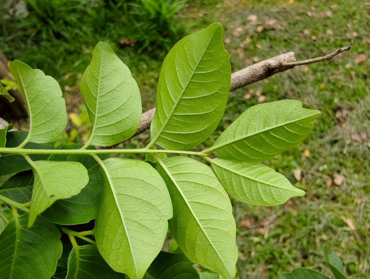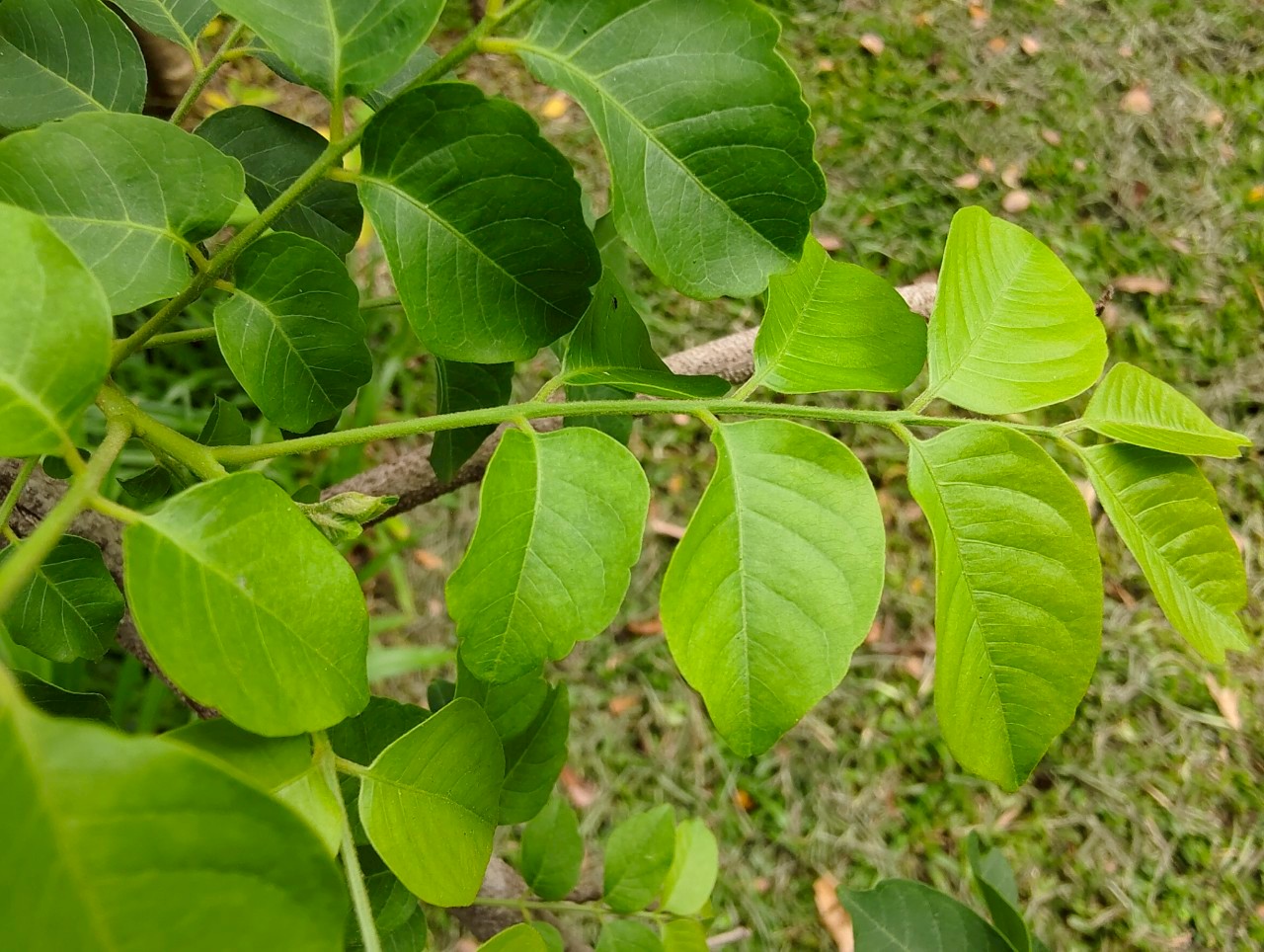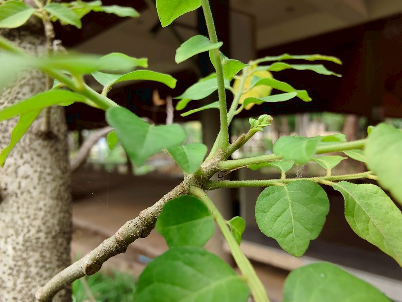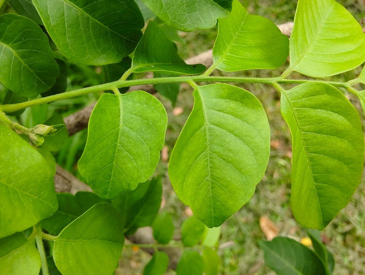 | ลักษณะใบ | ใบเป็นใบประกอบแบบขนนก ออกเรียงสลับ มีใบย่อย 5-9 ใบ ก้านใบประกอบยาวประมาณ 1-2 เซนติเมตร แกนกลางใบประกอบยาวประมาณ 7 เซนติเมตร ลักษณะของใบย่อยเป็นรูปรีหรือรูปไข่ ปลายใบแหลมยาวหรือเว้าตื้น โคนใบมนเบี้ยวไม่เท่ากันหรือเป็นรูปลิ่ม หลังใบและท้องใบเรียบ แผ่นใบมีขนยาวใกล้เส้นกลางใบทั้งสองด้าน |