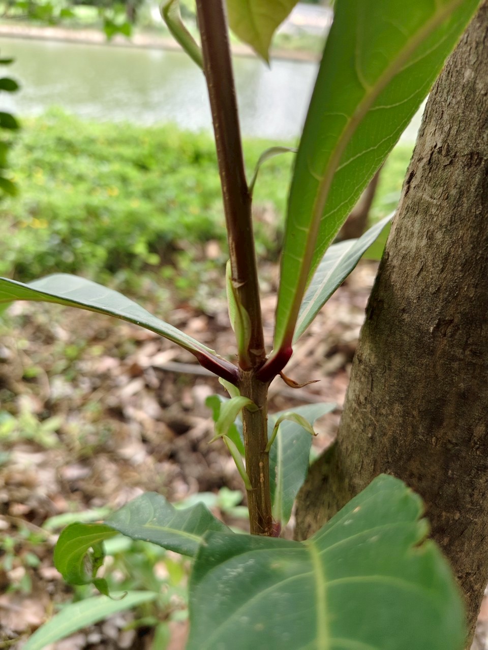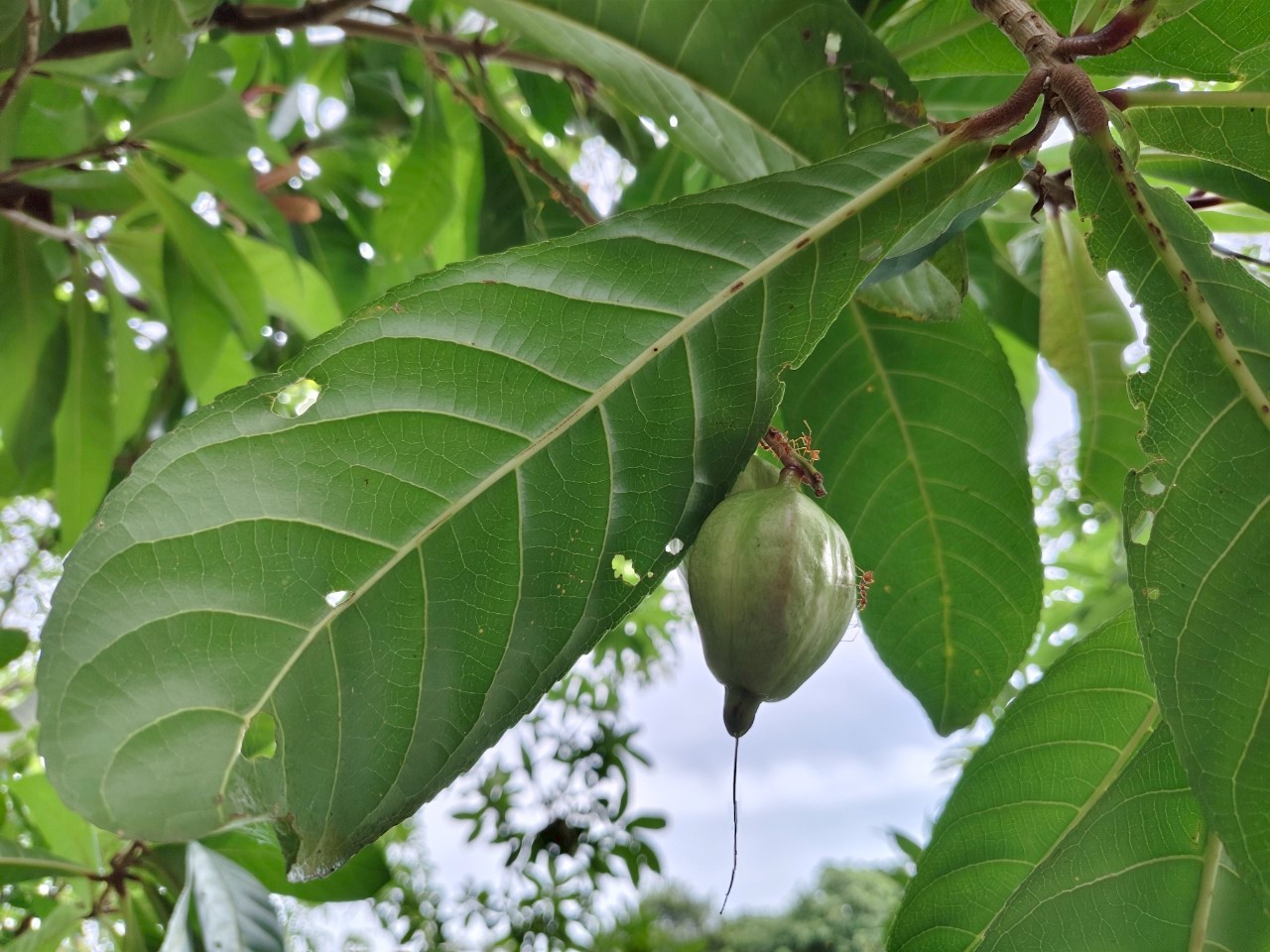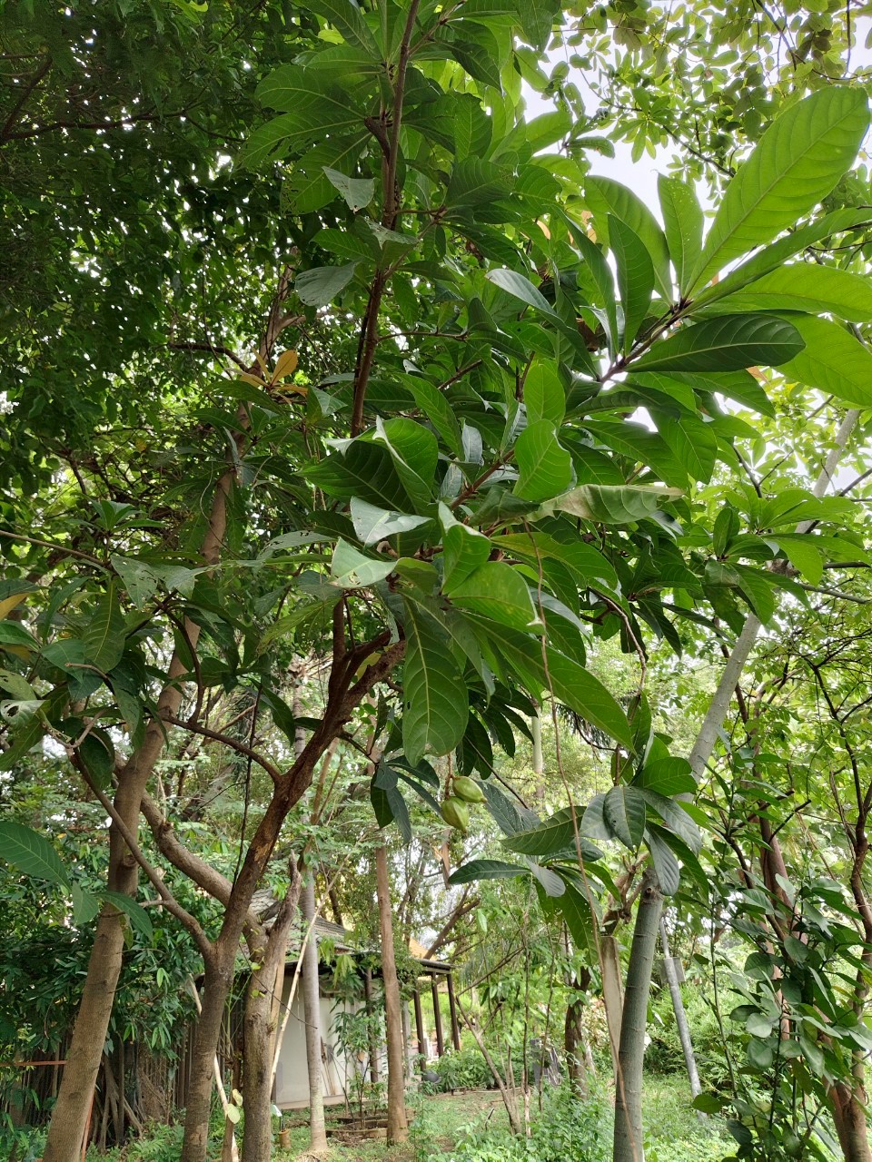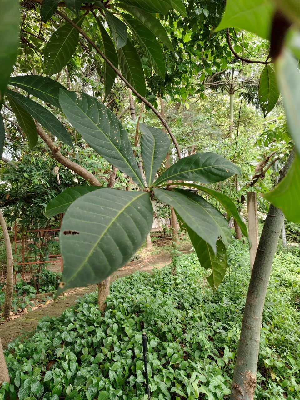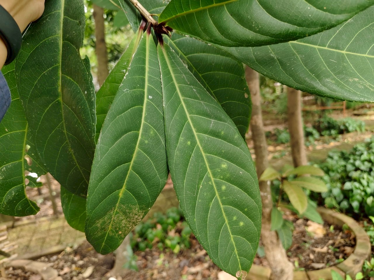 | ลักษณะใบ | ใบเป็นใบเดี่ยวรูปหอก ออกเวียนสลับเป็นกระจุกตามบริเวณปลายกิ่ง ขอบจักเป็นฟันเลื่อยถี่ ๆ ปลายใบกว้าง โคนใบสอบ เนื้อใบหนา สีเขียวเข้ม ไม่มีก้านใบ |