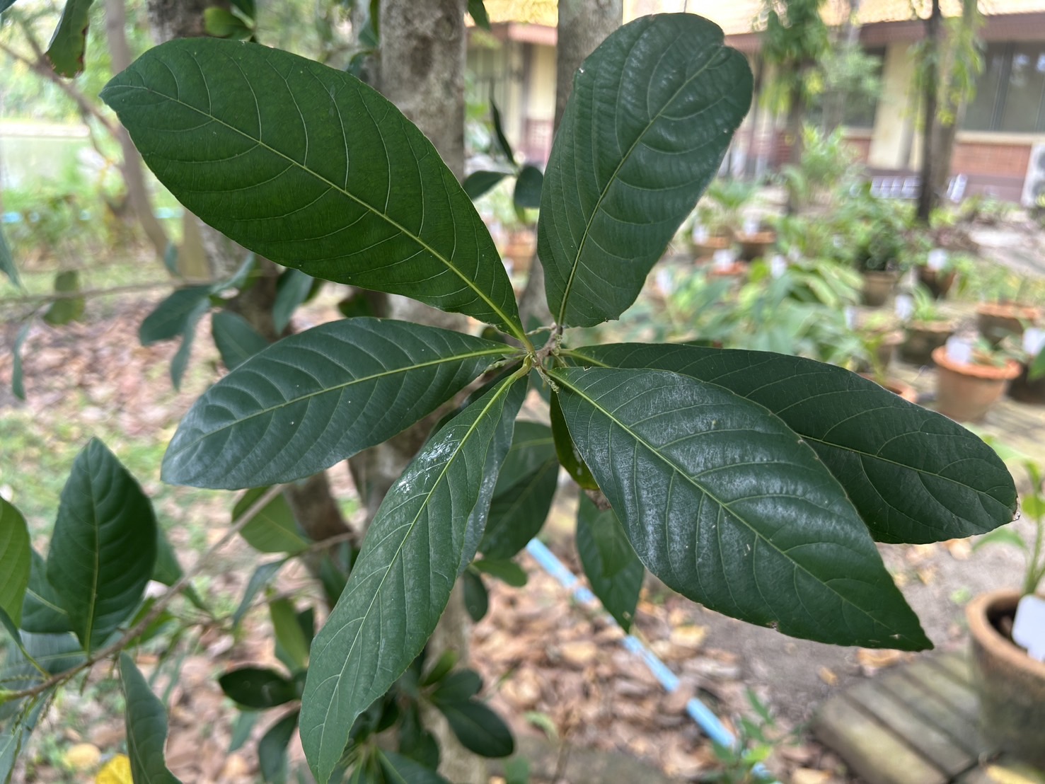 | ลักษณะใบ | ใบเป็นใบเดี่ยวออกเวียนสลับกันบริเวณปลายกิ่ง ใบเป็นรูปไข่กลับถึงรูปไข่กลับแกมขอบขนาน กว้างประมาณ 4-7 เซนติเมตร ยาวประมาณ 10-15 เซนติเมตร ปลายใบกลมมน หรือเป็นติ่งแหลม โคนสอบแคบ โคนสุดมน |