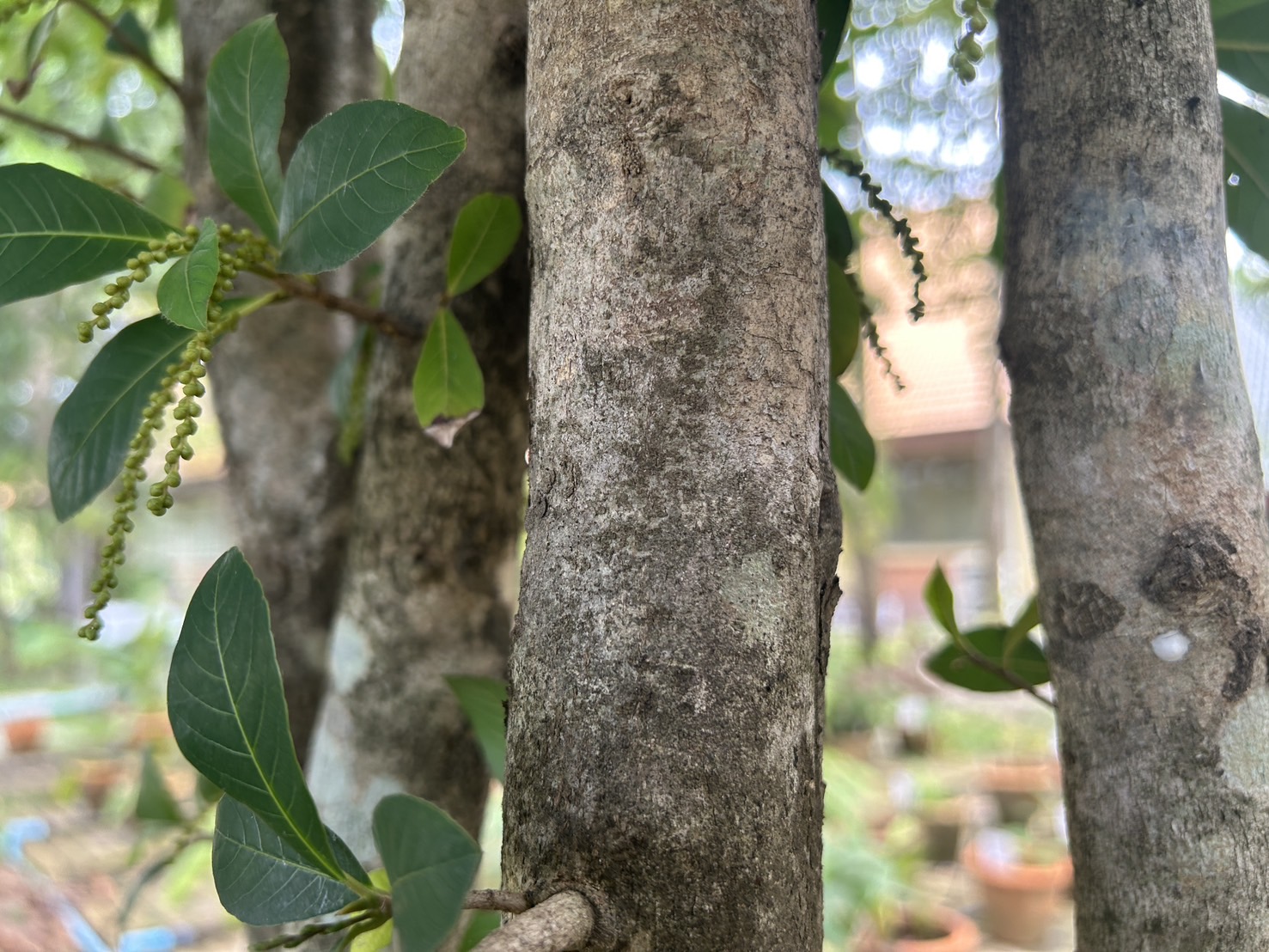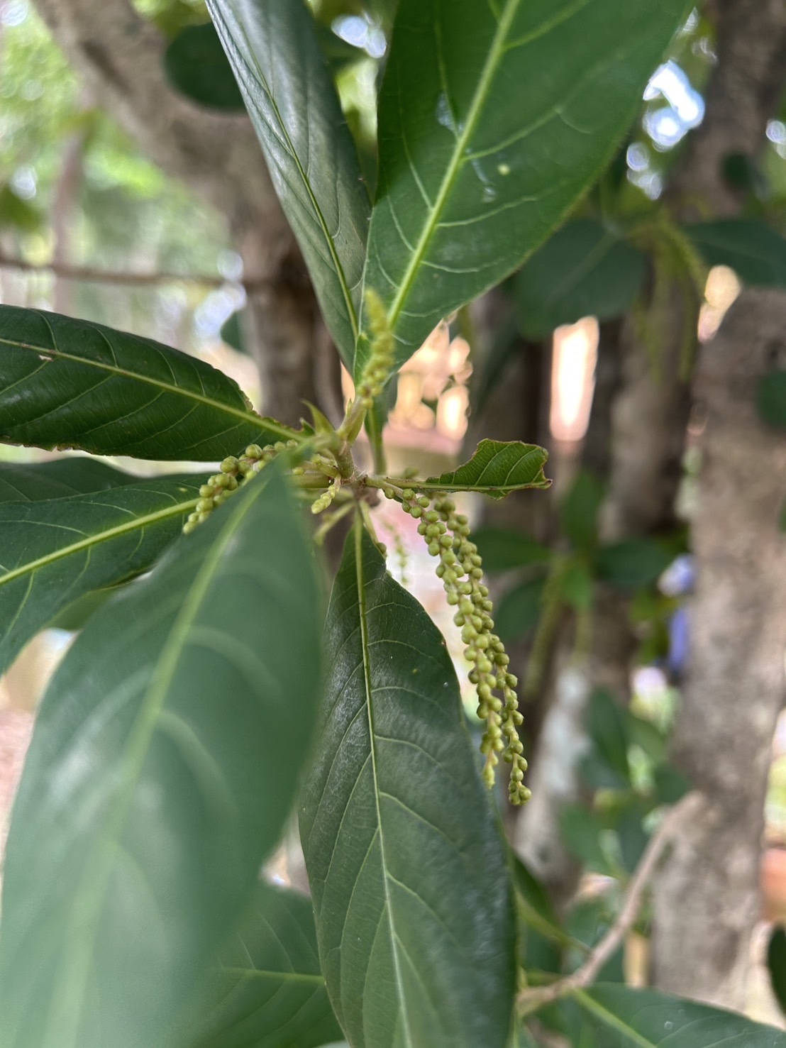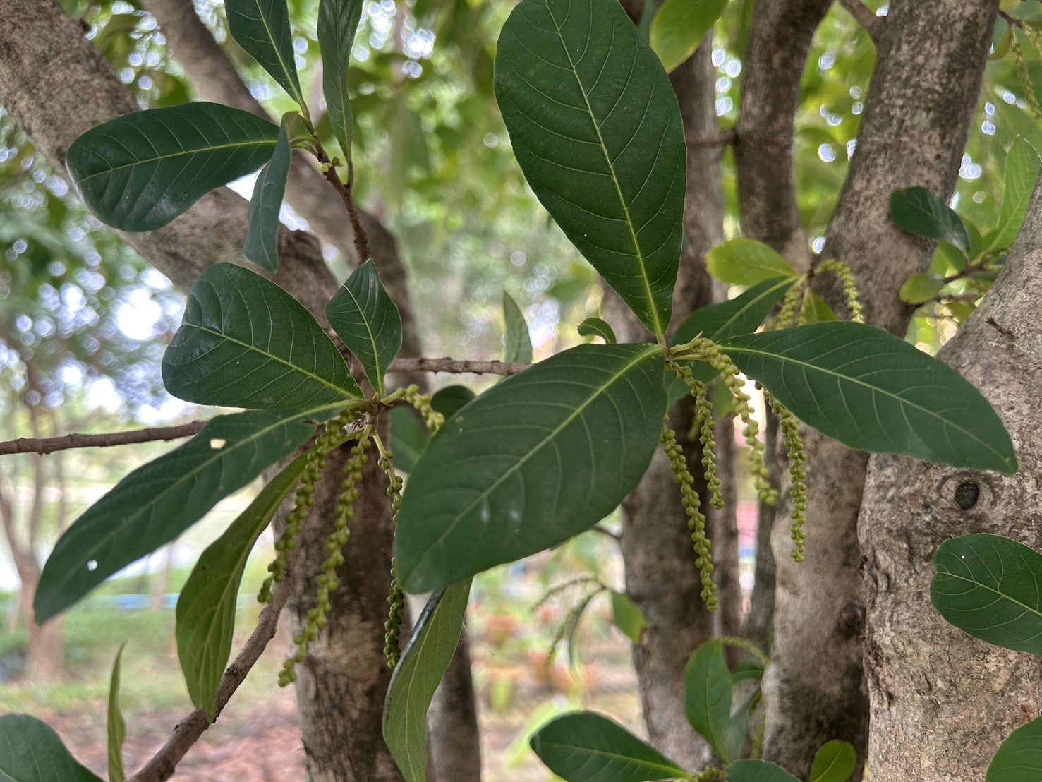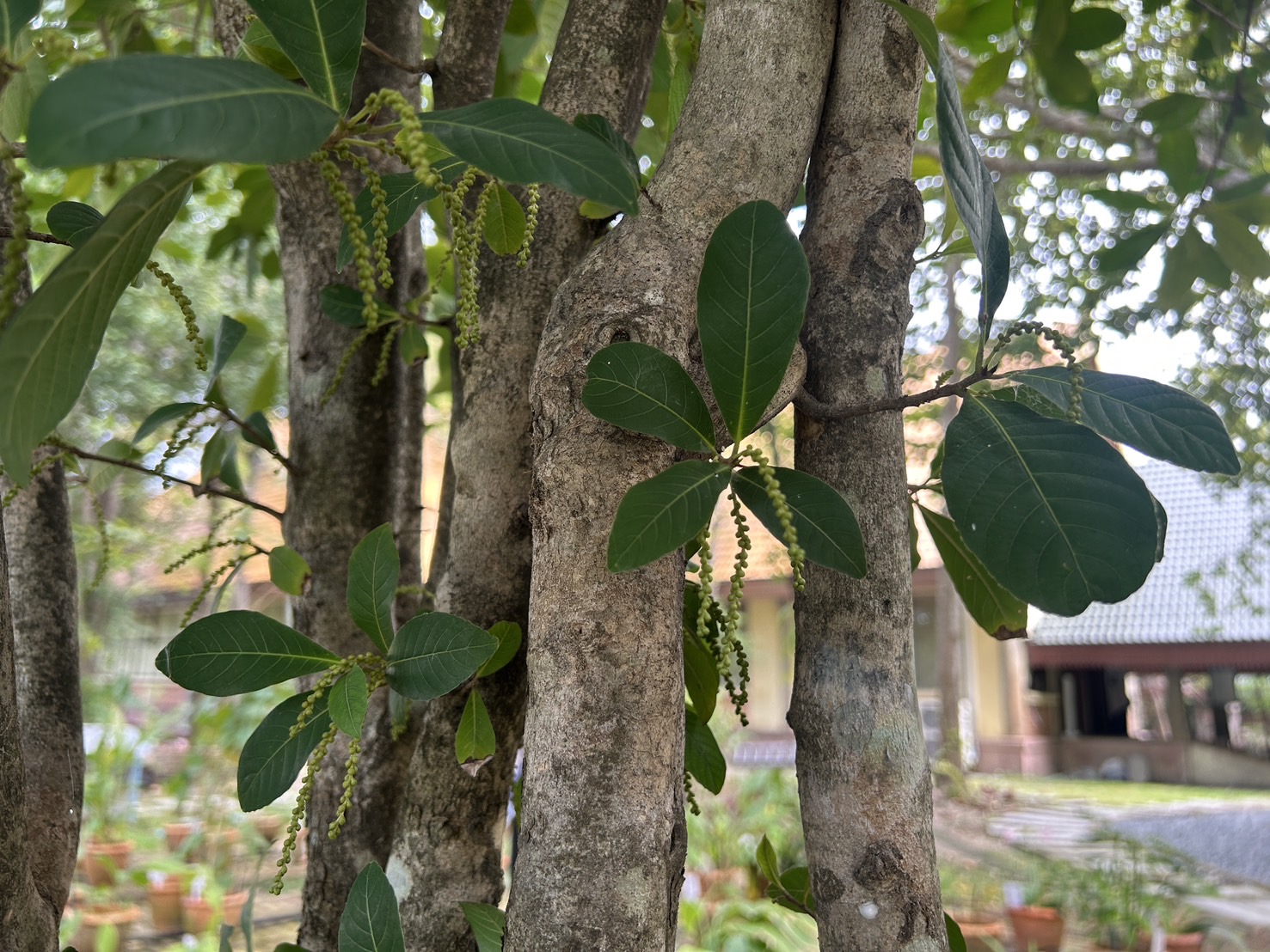 | ลักษณะดอก | ดอกมีขนาดเล็ก มีสีเขียว ออกเป็นช่อยาวตามง่ามใบ ช่อดอกยาวประมาณ 10-35 เซนติเมตร ห้อยลง ไม่มีก้านดอก ติดเป็นกระจุกเวียนบนแกนดอก กระจุกละ 2-3 ดอก เป็นดอกสมบูรณ์เพศ กลีบเลี้ยงเชื่อมกันเป็นรูปกรวย ปลายแยกเป็น 5-6 แฉก กลีบดอกติดอยู่ในท่อกลีบเลี้ยง |