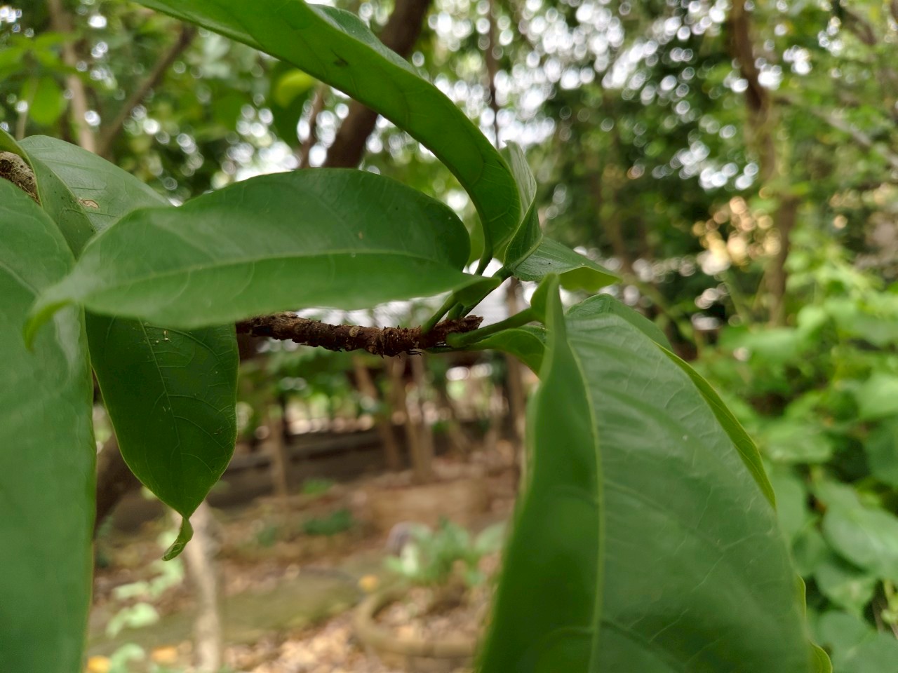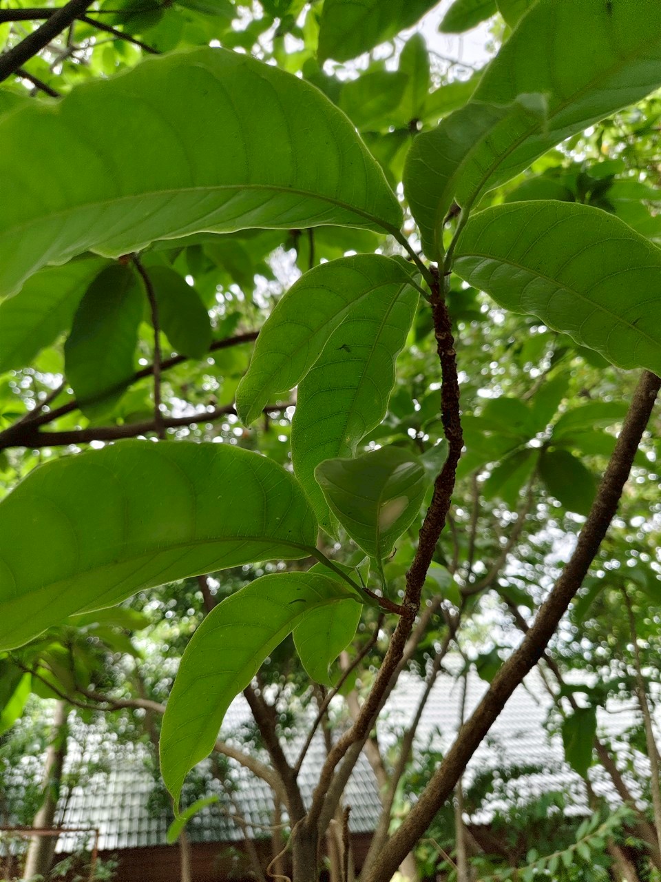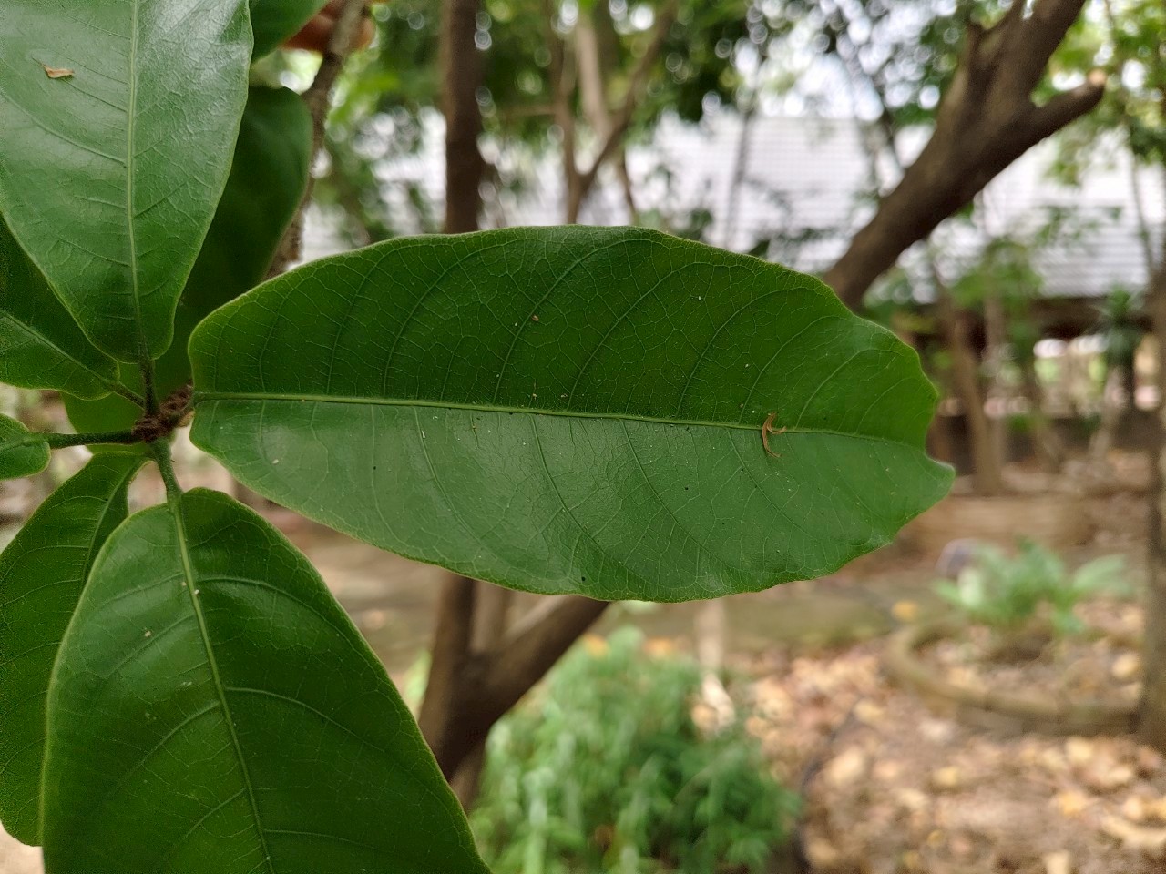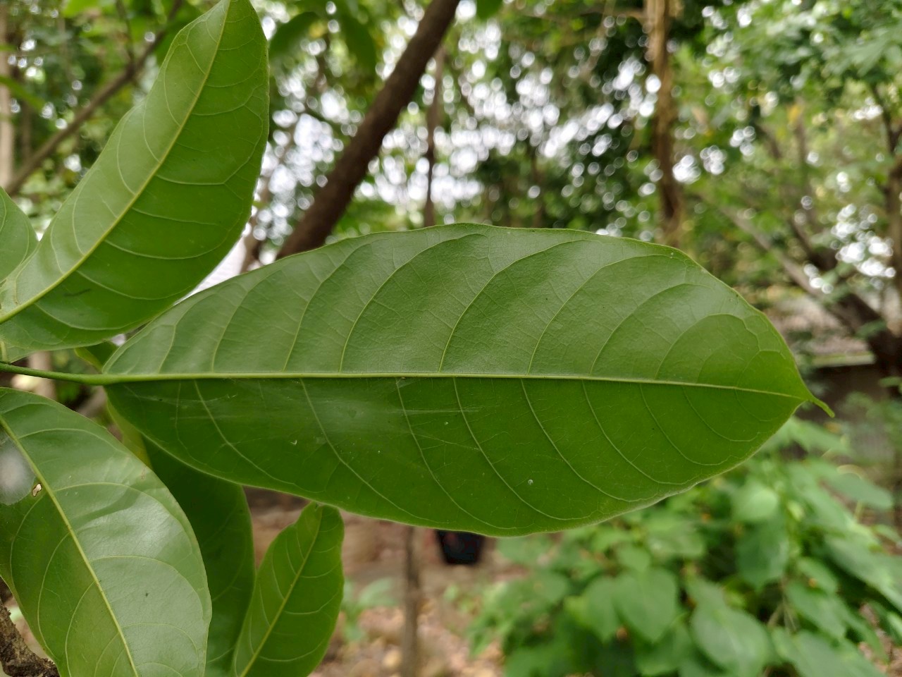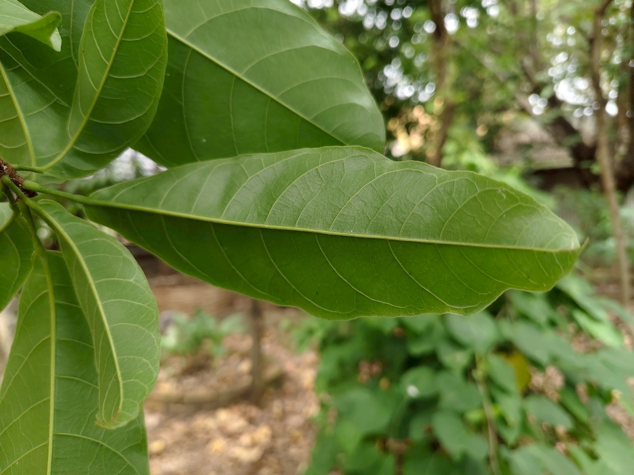 | ลักษณะใบ | ใบเดี่ยว เรียงสลับ มักกระจุกที่ปลายกิ่ง รูปรีหรือรูปขอบขนาน กว้าง 5-15 ซม. ยาว 10-30 ซม. โคนใบมน ปลายใบแหลม ขอบใบเป็นคลื่นเล็กน้อย ผิวใบหนา มัน และเรียบหรือย่นเล็กน้อย ก้านใบยาว 2-10 ซม. |