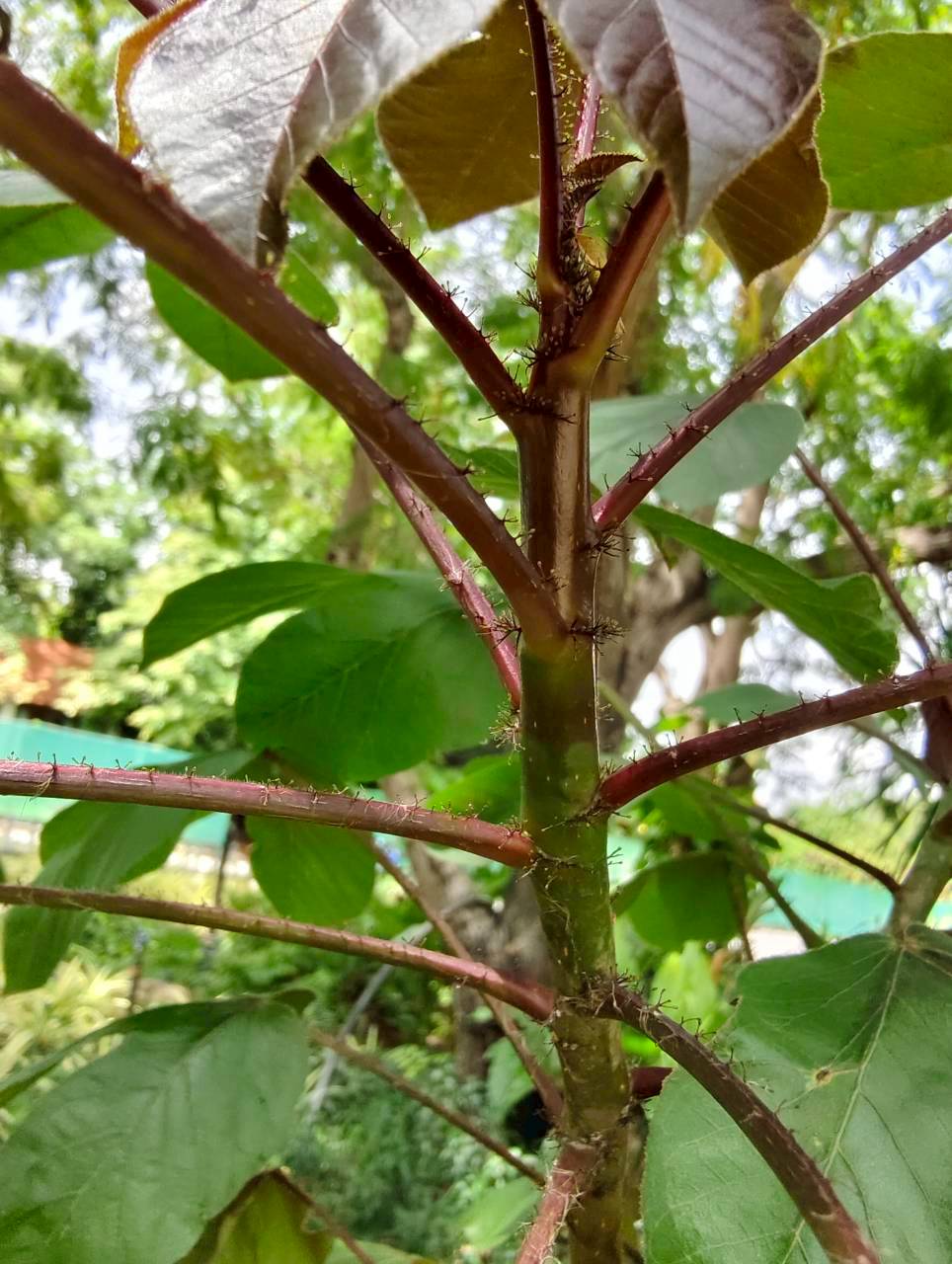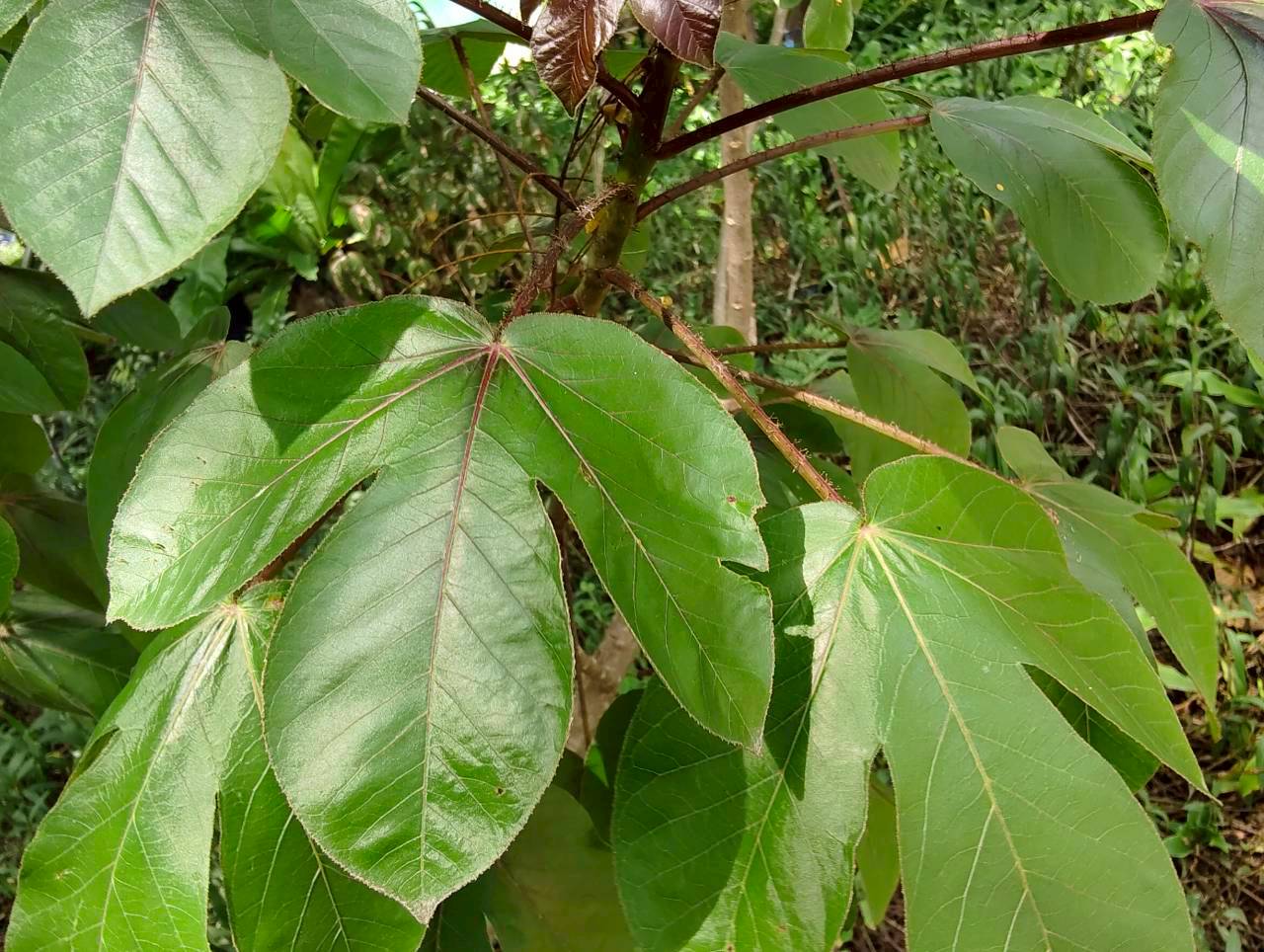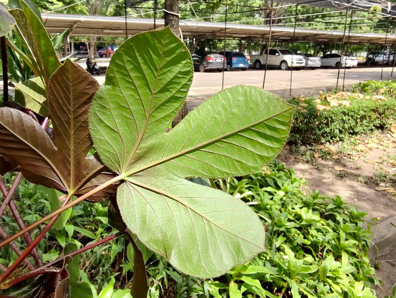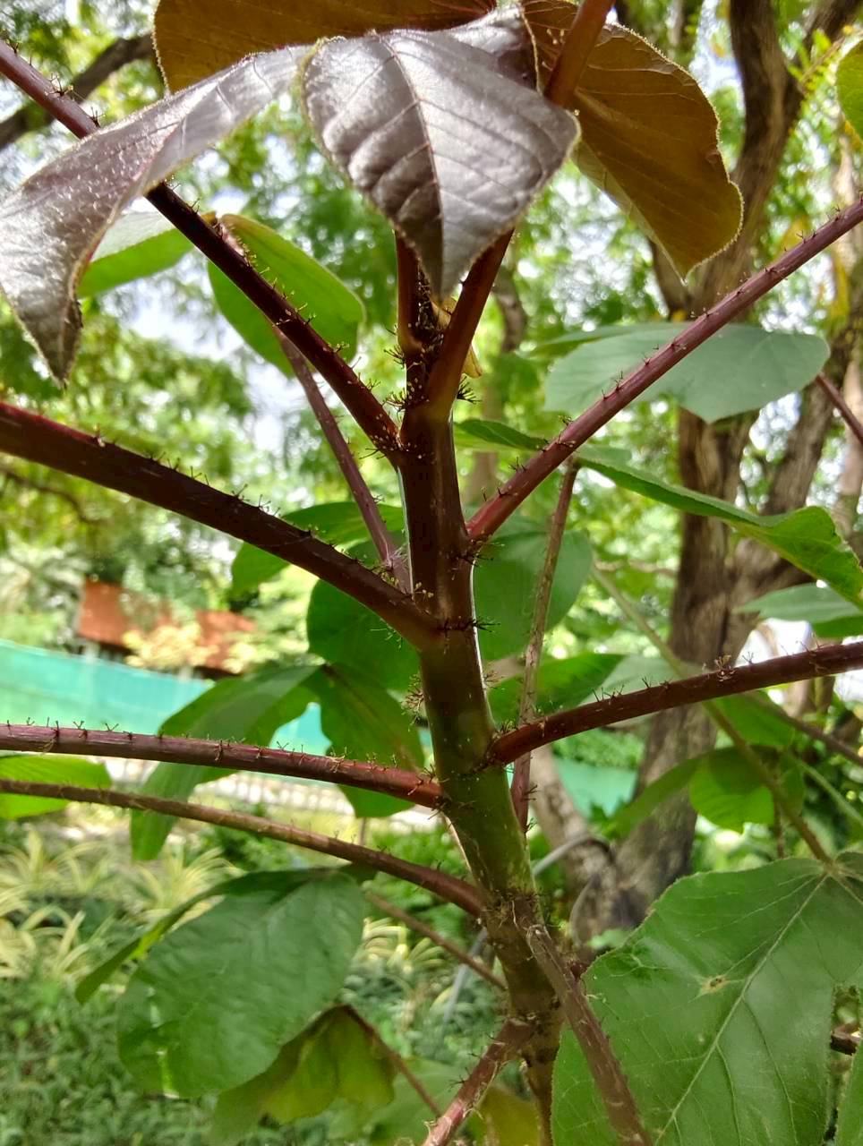 | ลักษณะใบ | ใบเป็นใบเดี่ยว ลักษณะของใบคล้ายฝ่ามือ มีเว้าลึกประมาณ 2-3 เว้า ก้านใบ ใบอ่อน และเส้นใบมีสีแดง ใบอ่อนมีสีม่วงเข้มหรือเป็นสีน้ำตาลแดง ส่วนใบแก่จะมีสีเขียวปนแดงและมีขน |