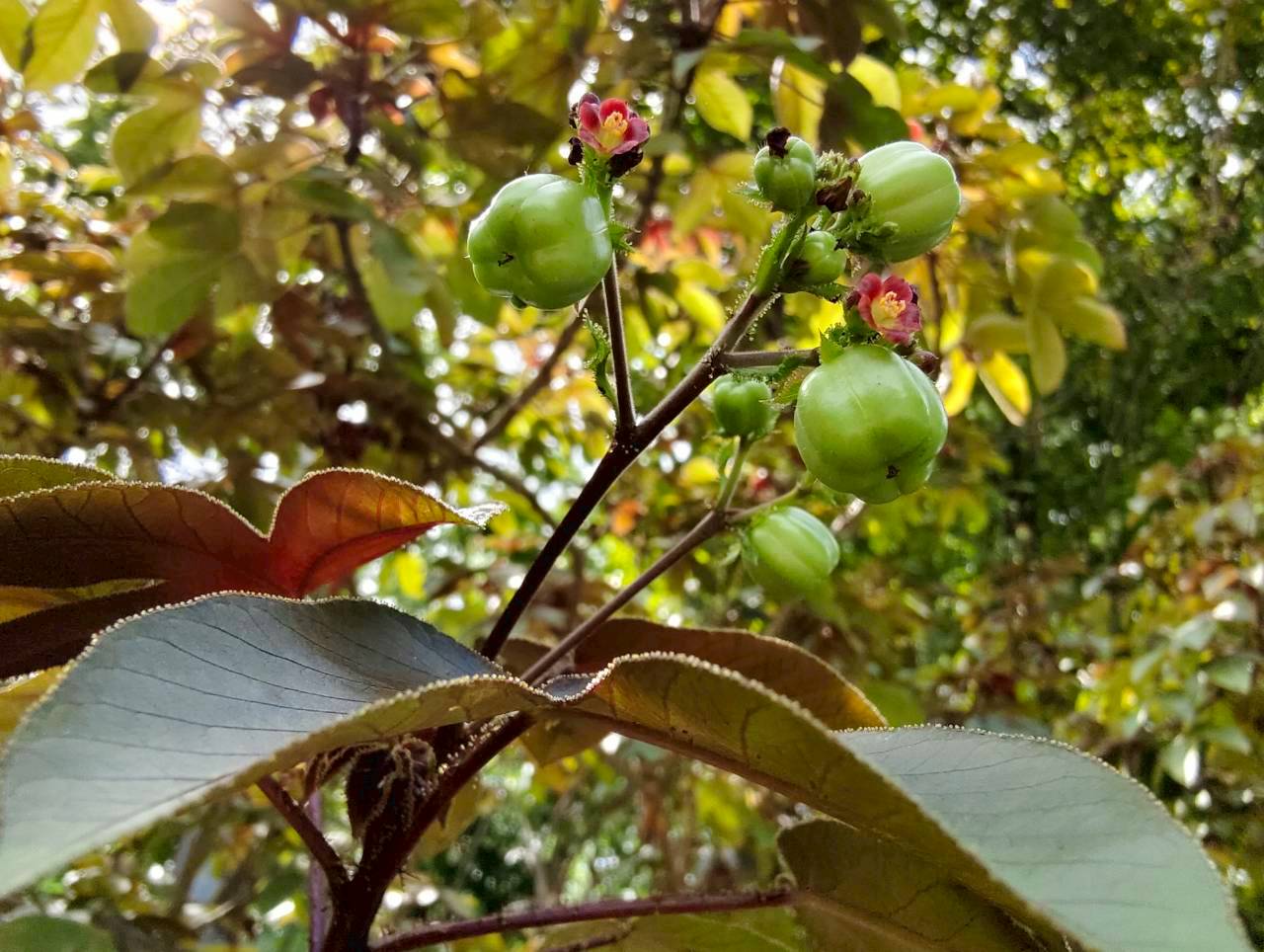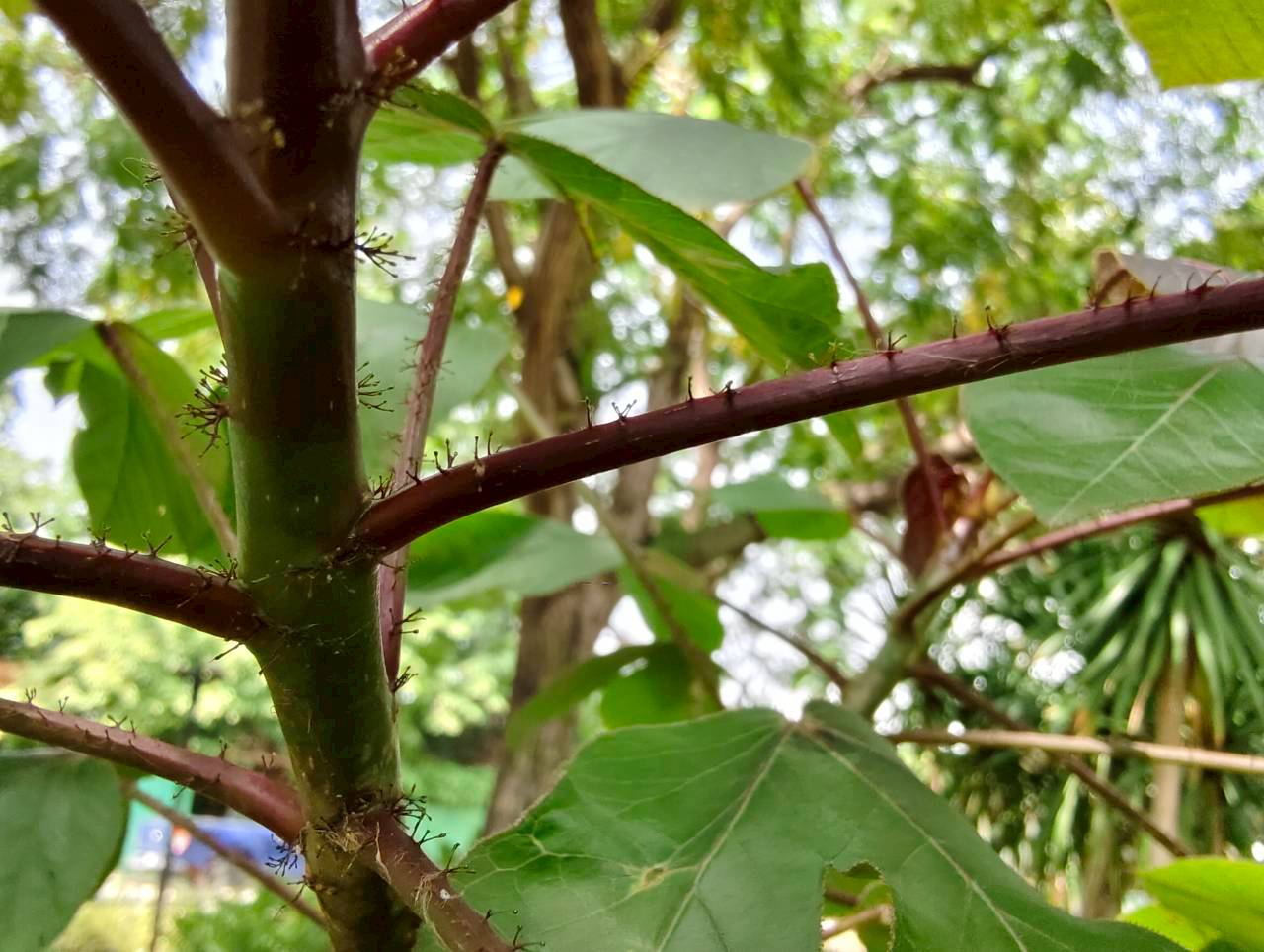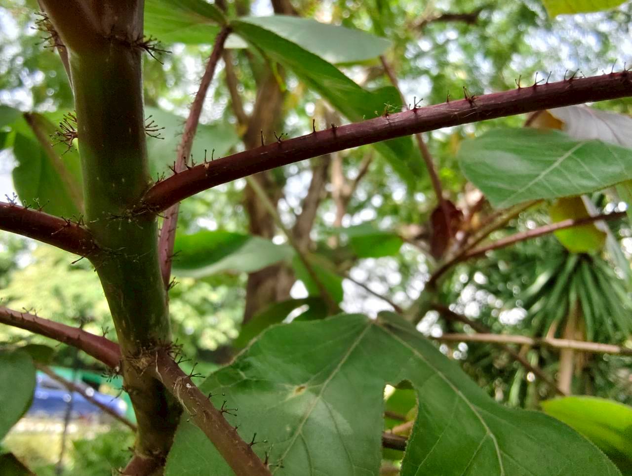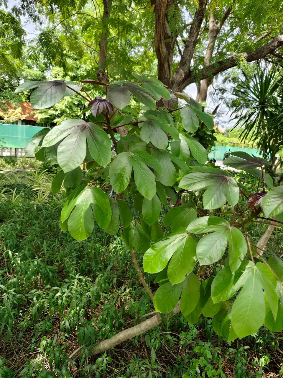 | ลักษณะใบ | ใบเป็นใบเดี่ยว ลักษณะของใบคล้ายฝ่ามือ มีเว้าลึกประมาณ 2-3 เว้า ก้านใบ ใบอ่อน และเส้นใบมีสีแดง ใบอ่อนมีสีม่วงเข้มหรือเป็นสีน้ำตาลแดง ส่วนใบแก่จะมีสีเขียวปนแดงและมีขน |