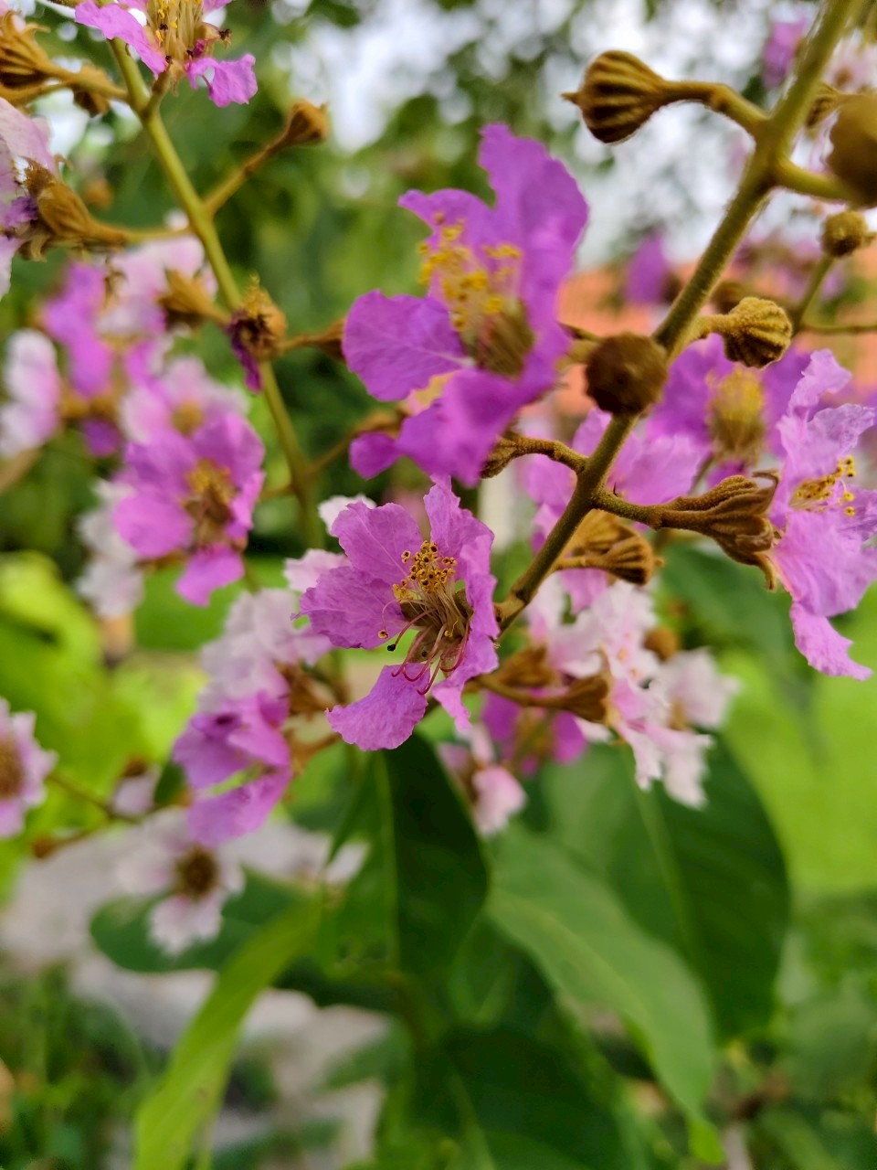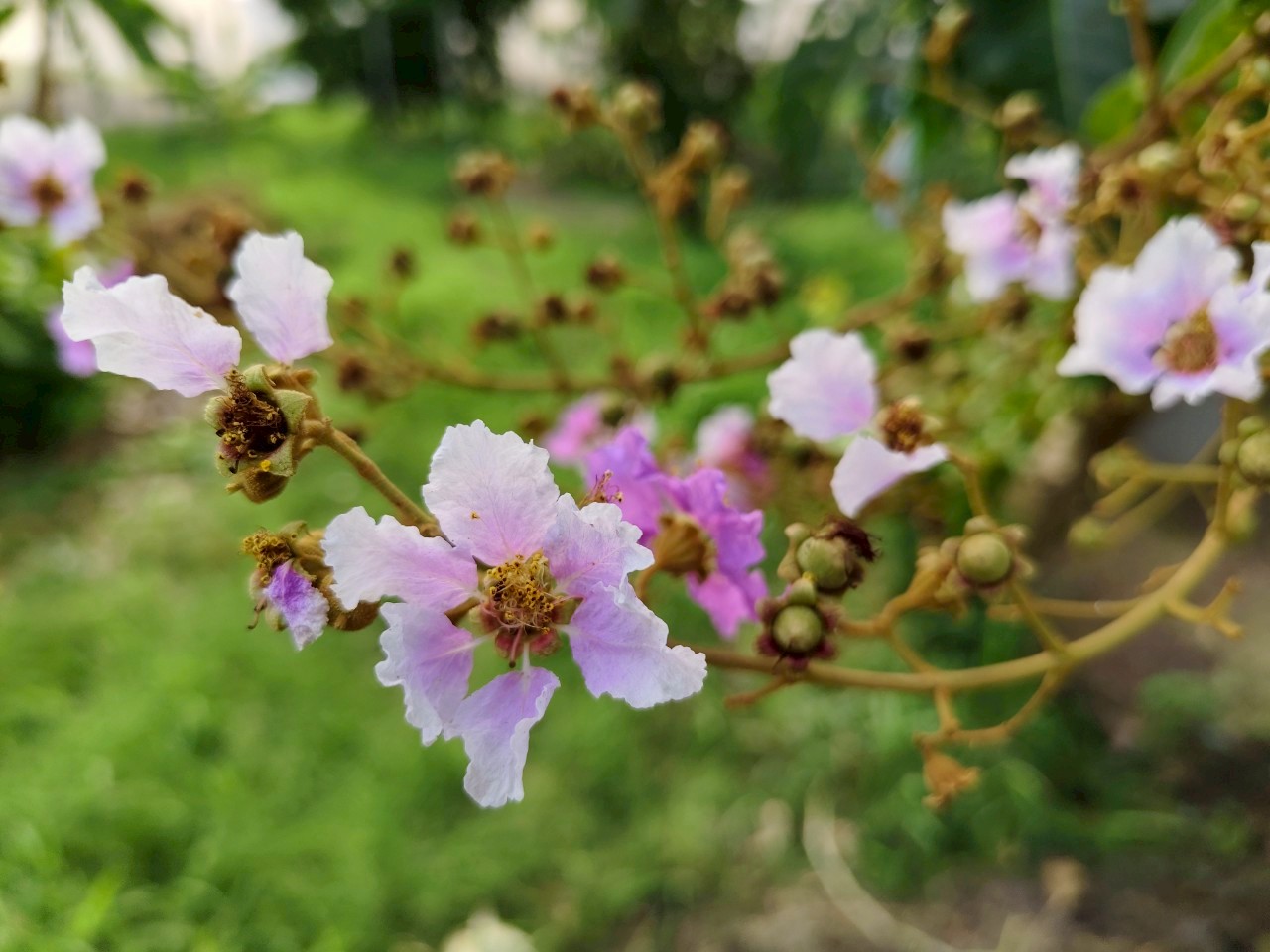 | ลักษณะดอก | ออกดอกเป็นช่อแบบเป็นกลุ่มย่อย ออกเป็นช่อโต ๆ ตามปลายกิ่ง ตามส่วนต่าง ๆ จะมีขนสาก ๆ ขึ้นทั่วไป ดอกจะมีขนาดเล็ก เมื่อบานเต็มที่จะมีขนาดเส้นผ่านศูนย์กลางประมาณ 0.5-1.5 เซนติเมตร ดอกมีกลีบดอก 6 กลีบ แยกจากกันเป็นอิสระ โคนกลีบติดกับผนังด้านในของถ้วยกลีบเลี้ยง โคนกลีบดอกแคบ ส่วนปลายกลีบจะเป็นแผ่นกลม ๆ สีขาวหรือสีม่วงอมชมพูอ่อน ๆ ส่วนกลีบเลี้ยงมี 6 กลีบ โคนกลีบเลี้ยงเชื่อมติดกันเป็นรูปถ้วย ปลายแยกออกเป็น 6 แฉก |