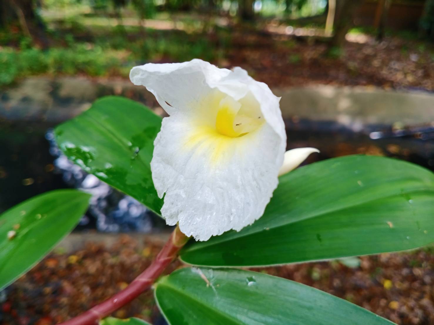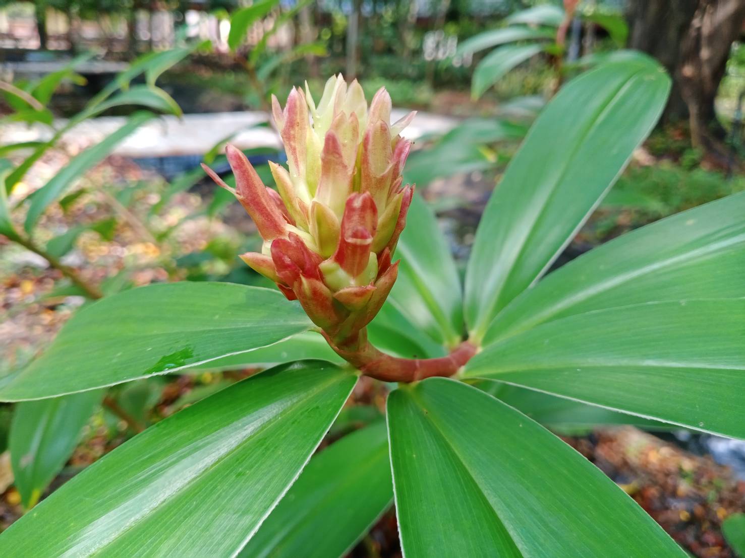 | ลักษณะดอก | ออกดอกเป็นช่อ บริเวณปลายยอดของลำต้น กาบรองดอกเป็นรูปไข่ปลายแหลม ปลายแข็งคล้ายหนาม สีเขียวปนแดง ยาวประมาณ 1.5-4.5 เซนติเมตร ในแต่ละกาบรองรับดอกย่อย 1 ดอก ดอกจะทยอยบายครั้งละ 1-2 ดอก กลีบเลี้ยงดอกเชื่อมติดกันเป็นหลอด ๆ และเป็นสัน 3 สัน ปลายแยกเป็น 3 กลีบ แยกออกเป็น 2 ปาก มีปากด้านบน 2 กลีบ และปากด้านล่าง 1 กลีบ กลีบแยกลึก ส่วนกลีบดอกนมี 3 กลีบ มีขนาดกว้างประมาณ 1.5-2 เซนติเมตร และยาวประมาณ 4-5 เซนติเมตร โคนกลีบดอกเชื่อมติดกันเล็กน้อย และมีสีขาว |