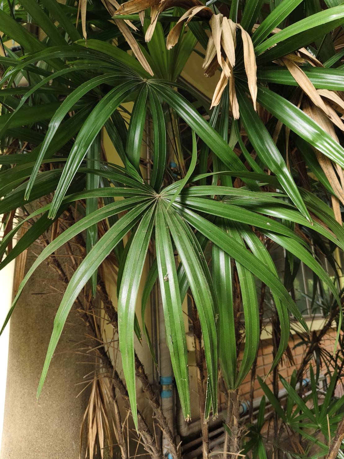 | ลักษณะใบ | ใบประกอบ เรียงสลับ รูปพัด กว้างประมาณ 40 เซนติเมตร ขอบหยักเว้าถึงสะดือ ใบย่อย 10-20 ใบ รูปแถบแคบ กว้างประมาณ 2 เซนติเมตร ยาว 15-18 เซนติเมตร ปลายทู่ โคนรูปลิ่ม ขอบเรียบ ใบหนา เป็นมัน แผ่นใบสีเขียวเข้ม แผ่เป็นครึ่งวงกลม ก้านใบเรียบ เป็นมัน |