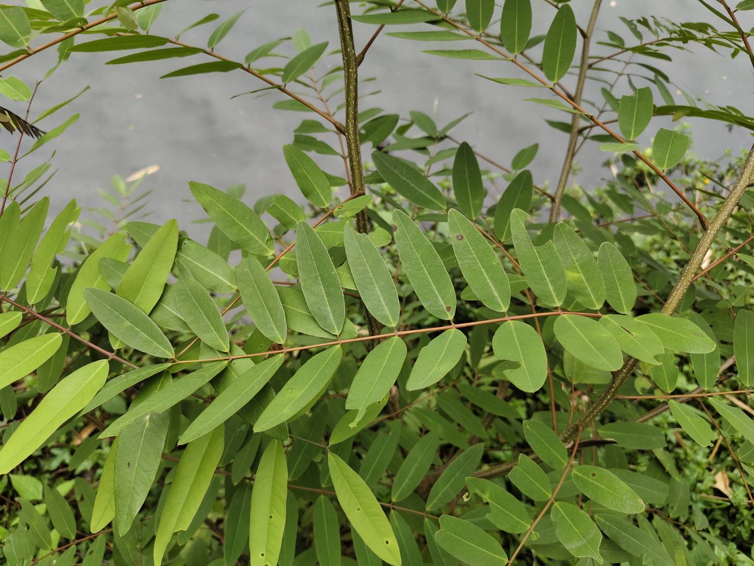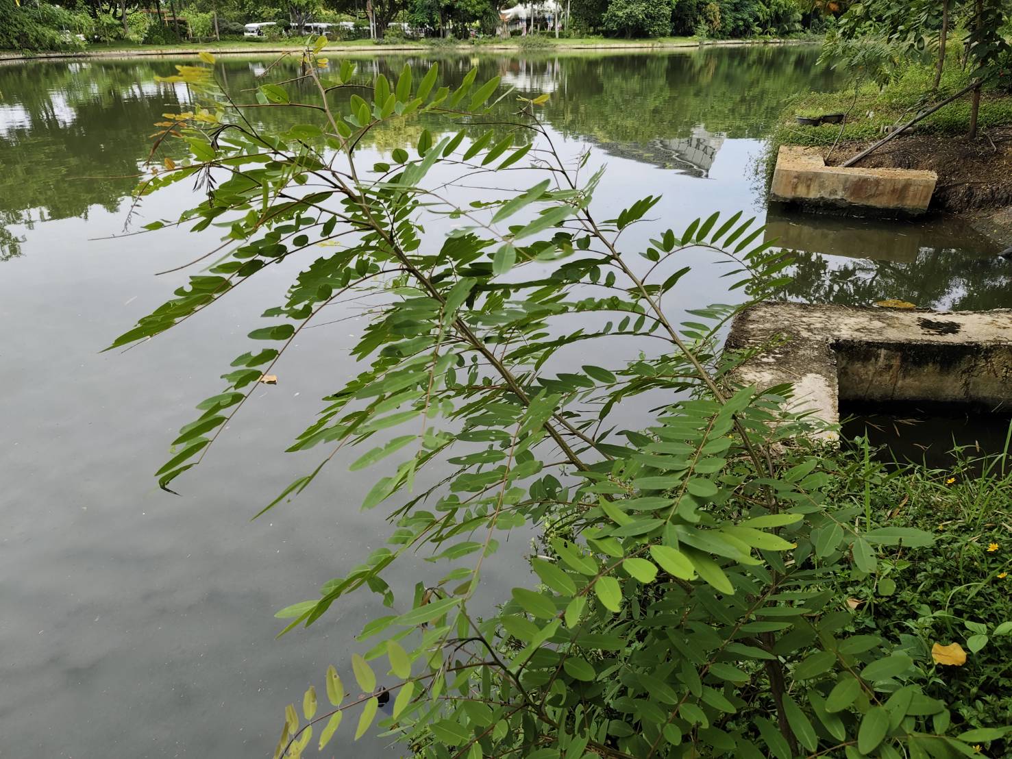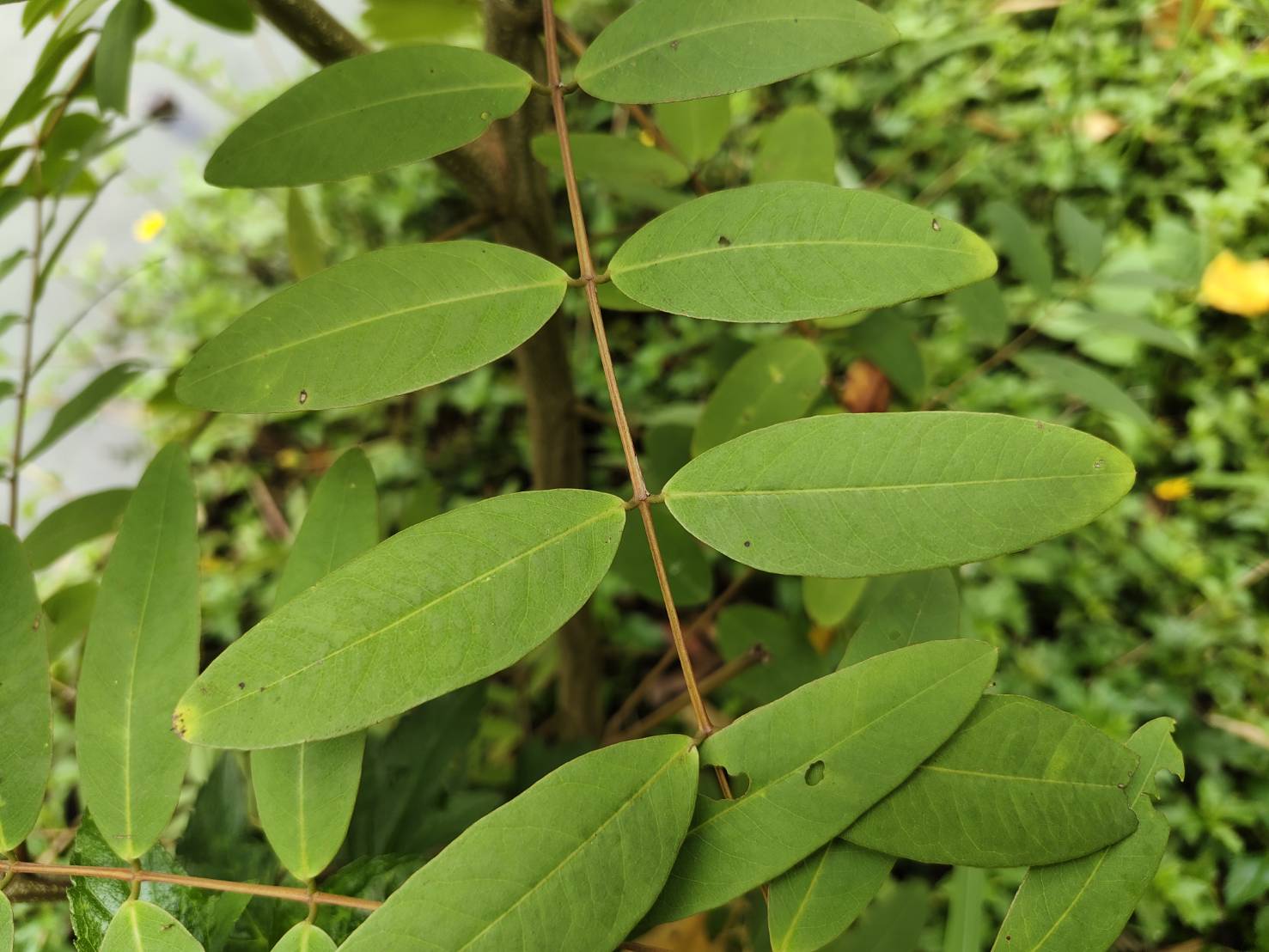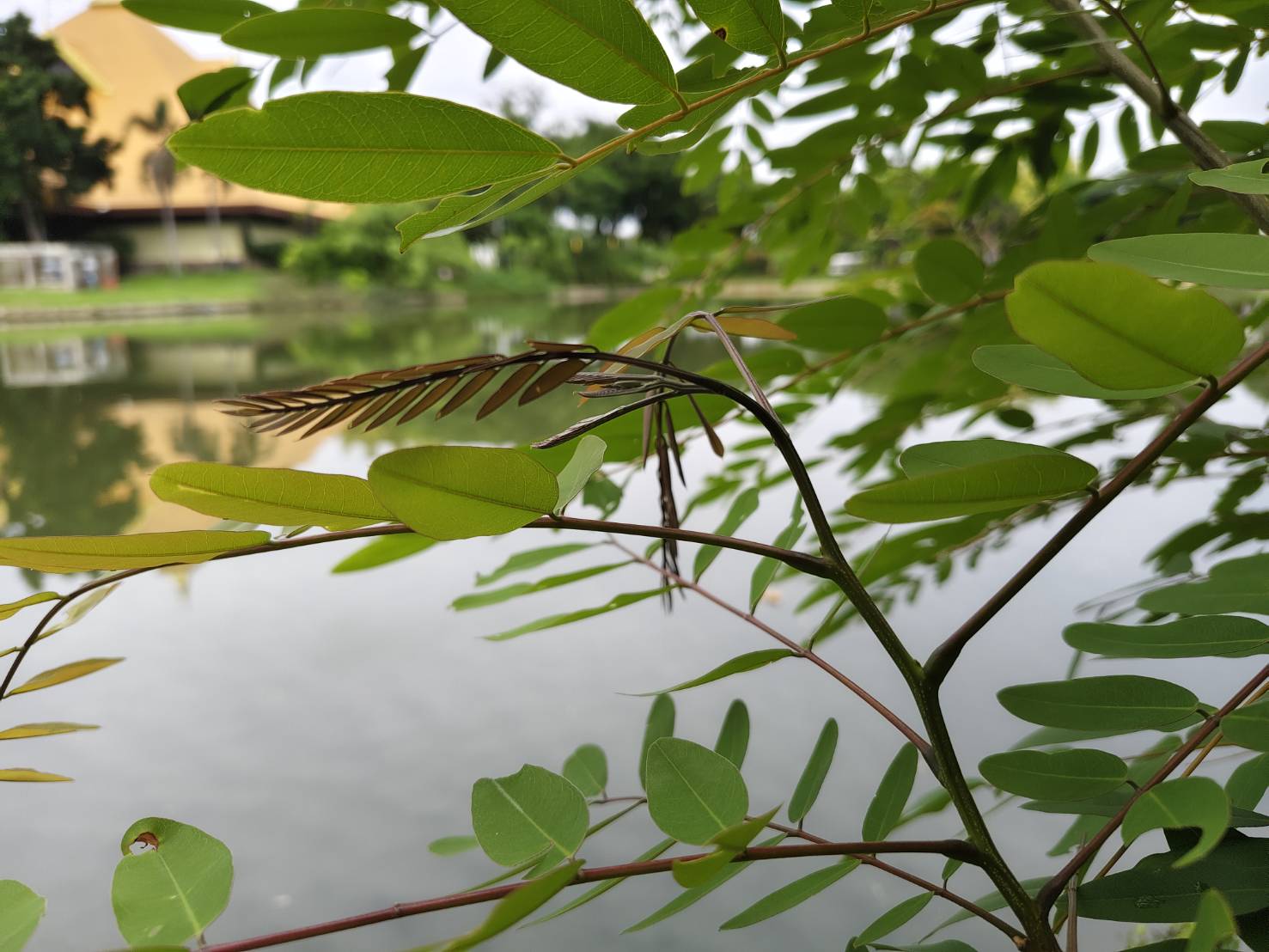 | ลักษณะใบ | เป็นใบประกอบแบบขนนก เรียงสลับกัน ใบเป็นสีเขียวเข้ม มีใบย่อยรูปรี 5-12 คู่ กว้างประมาณ 1.5 เซนติเมตร ยาวประมาณ 4 เซนติเมตร ที่ปลายสุดเป็นใบเดี่ยว ปลายใบเว้าตื้น โคนใบมน ขอบและแผ่นใบเรียบ |