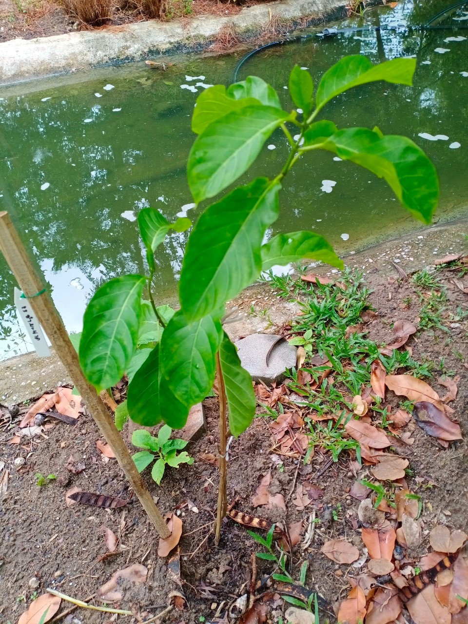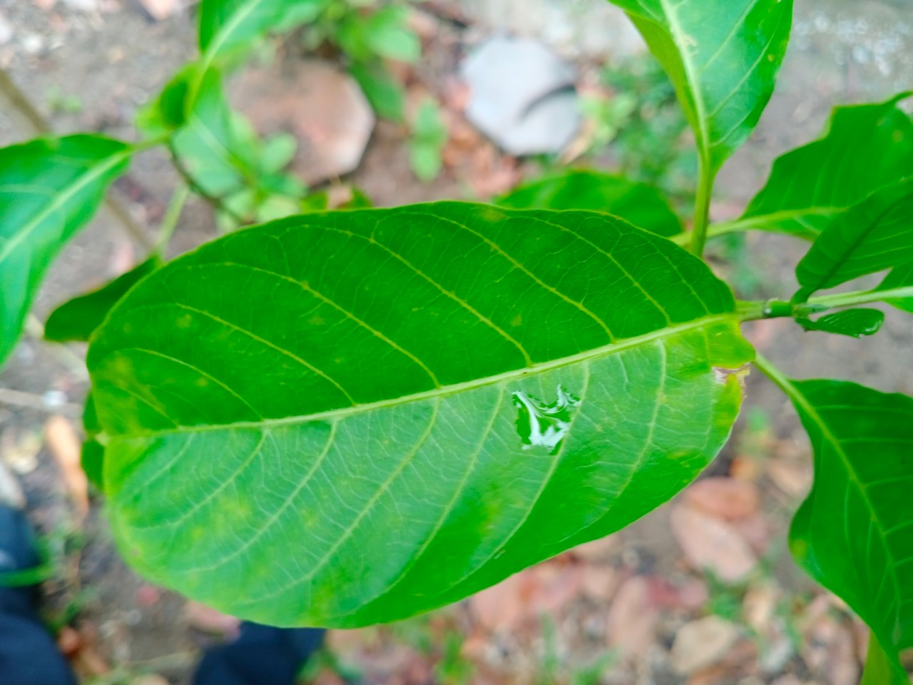 | ลักษณะใบ | ใบเป็นใบเดี่ยว ออกตรงข้ามกัน รูปรีกว้างแกมรูปไข่กลับ กว้าง 4-8 ซม. ยาว 7-15 ซม. ปลายใบเป็นติ่งแหลม โคนใบมน ขอบใบเรียบและเป็นคลื่นเล็กน้อย แผ่นใบเรียบมีสีเขียวเข้มเป็นมัน ก้านใบยาว 2-3 ซม. |