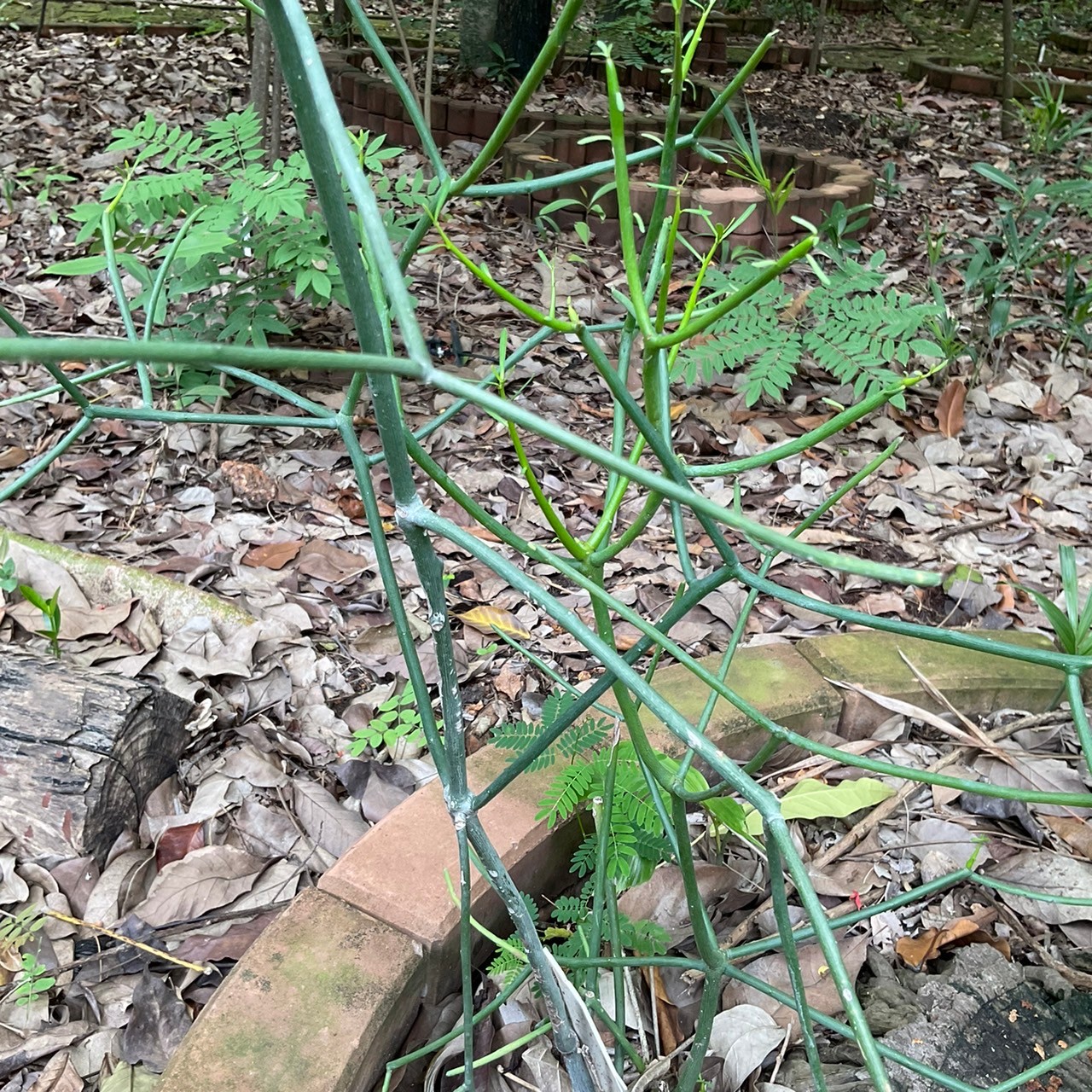 | ลักษณะวิสัย | เป็นไม้ยืนต้นขนาดเล็ก มีความสูงของต้นประมาณ 4-7 เมตร ลำต้นแตกกิ่งก้านสาขามาก ดูคล้ายกับปะการัง เปลือกลำต้นแก่เป็นสีน้ำตาลเข้ม ไม่มีหนาม ส่วนกิ่งอ่อนเป็นรูปทรงกระบอกเป็นสีเขียวเรียบเกลี้ยง อวบน้ำ เมื่อหักหรือกรีดดูจะมีน้ำยางสีขาวข้นออกมาจำนวนมาก |
