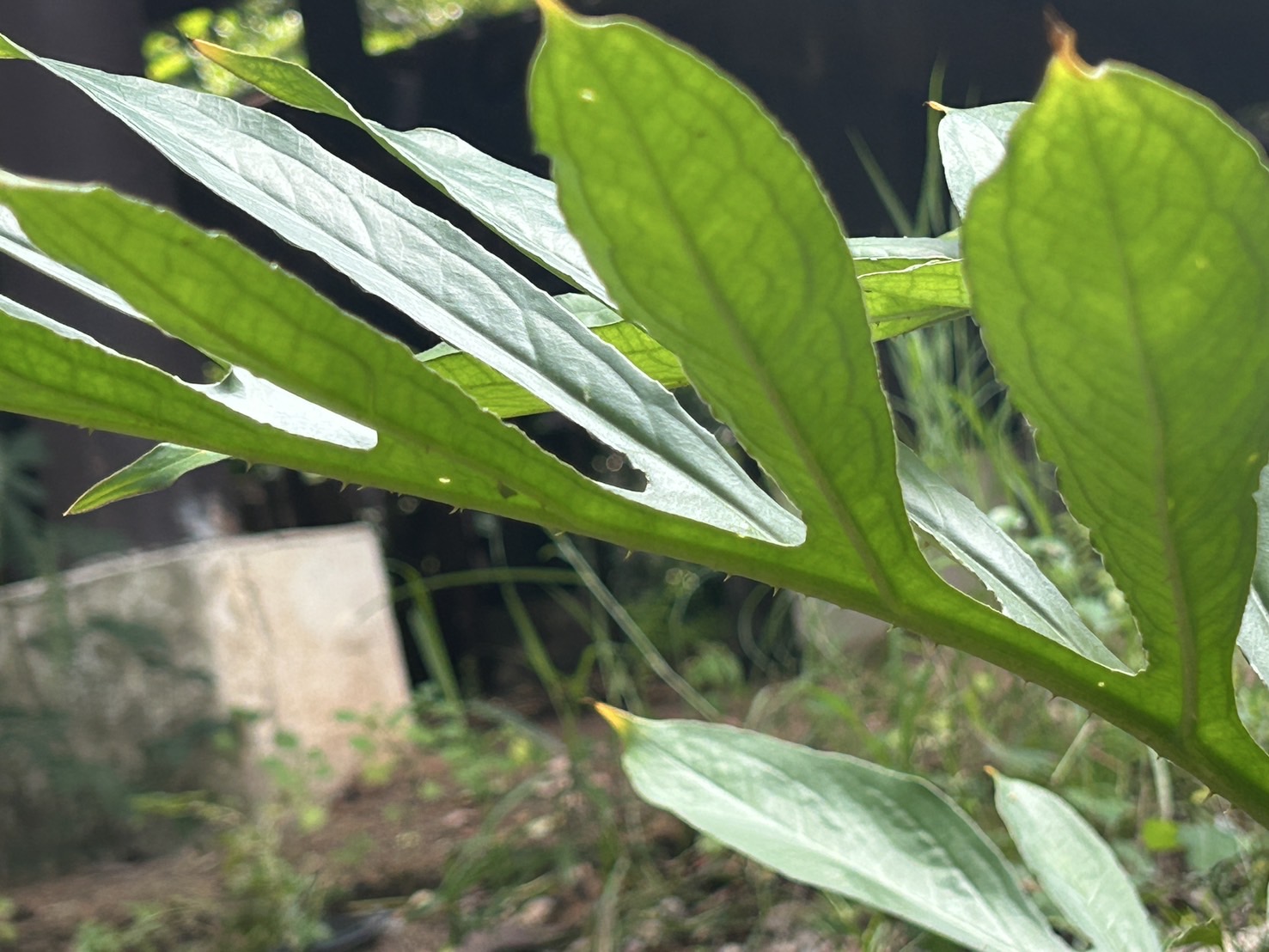 | ลักษณะใบ | ใบเป็นใบเดี่ยว ออกเรียงสลับ ใบเป็นรูปหัวลูกศรหรือรูปโล่ ปลายใบแหลม ขอบใบเรียบและหยักเว้นลึกเป็น 9 พู รอยเว้ามักลึกเกือบถึงเส้นกลางใบ มีหนามแหลมตามเส้นใบด้านล่างและตามก้านใบ ใบอ่อนม้วนเป็นแท่งกลม ก้านใบเป็นรูปทรงกระบอกยาวและแข็ง |