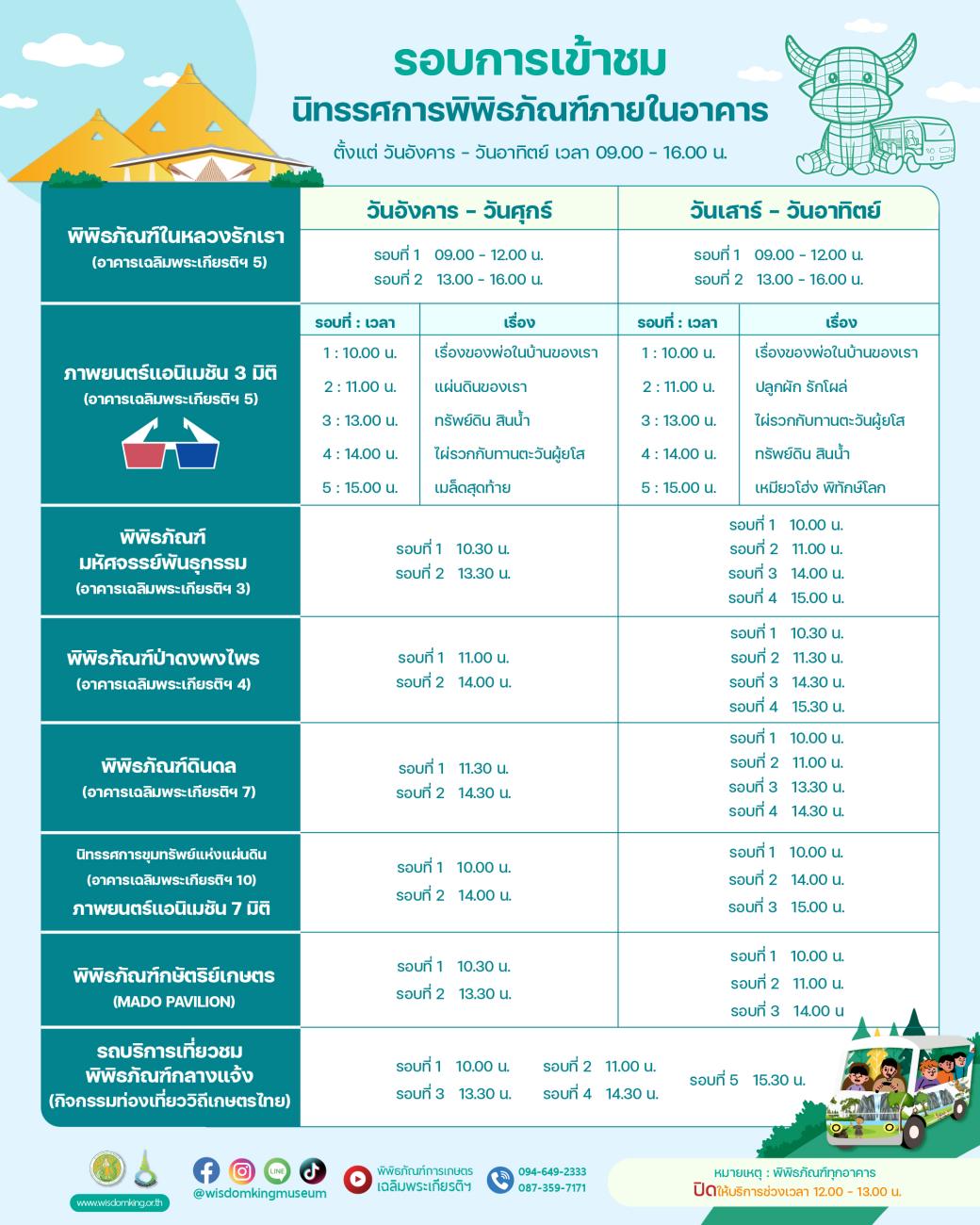 - ไม่อนุญาตให้นำอาหารและเครื่องดื่มเข้าไปในพื้นที่พิพิธภัณฑ์การเกษตรเฉลิมพระเกียรติฯ และภายในอาคารพิพิธภัณฑ์