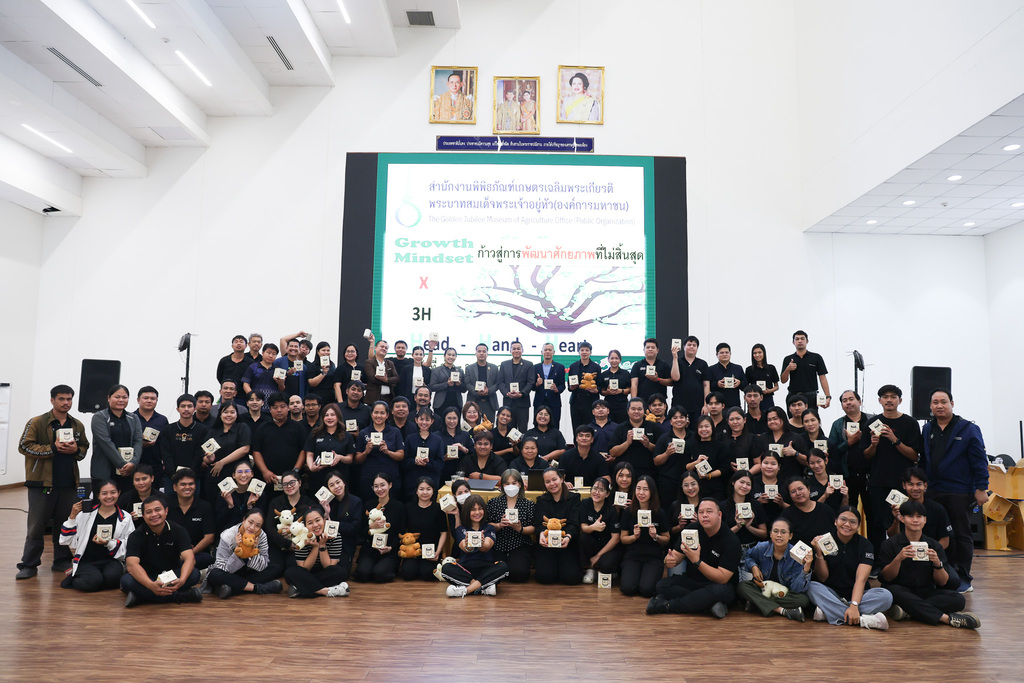 สำนักงานพิพิธภัณฑ์เกษตรเฉลิมพระเกียรติพระบาทสมเด็จพระเจ้าอยู่หัว (องค์การมหาชน) จัดโครงการพัฒนาศักยภาพบุคลากร ประจำปีงบประมาณ พ.ศ. 2569 อบรมเชิงปฏิบัติการหลักสูตร “Growth Mindset : ก้าวสู่การพัฒนาศักยภาพที่ไม่สิ้นสุด” เพื่อเสริมสร้างการรับรู้ ความร่วมมือ และการปรับทัศนคติที่ส่งผลต่อการทำงานร่วมกันอย่างมีประสิทธิภาพ ตลอดจนสามารถนำองค์ความรู้ที่ได้รับไปปรับประยุกต์ใช้ในการปฏิบัติงานจริง โดยมี พันจ่าเอก ประเสริฐ มาลัย ผู้อำนวยการ พกฉ. เป็นประธานเปิดการอบรม โดยมีคณะผู้บริหาร และเจ้าหน้าที่ พกฉ. เข้าร่วมการอบรมอย่างพร้อมเพรียง โดยได้รับเกียรติจาก นายจักรกฤษ รุ่งระวี วิทยากรผู้ทรงคุณวุฒิพร้อมคณะวิทยากร มาถ่ายความรู้ แนวคิดและเทคนิคการพัฒนา Growth Mindset เพื่อปรับใช้กับการทำงาน เสริมสร้างมุมมองเชิงบวก การทำงานเป็นทีม และการสื่อสารที่มีประสิทธิภาพภายในองค์กร โครงการดังกล่าวจัดขึ้นระหว่างวันที่ 20 – 21 ธันวาคม 2568 ณ ห้องประชุมศาสตร์พระราชา ชั้น 2 อาคารสำนักงานพิพิธภัณฑ์เกษตรเฉลิมพระเกียรติฯ จังหวัดปทุมธานี