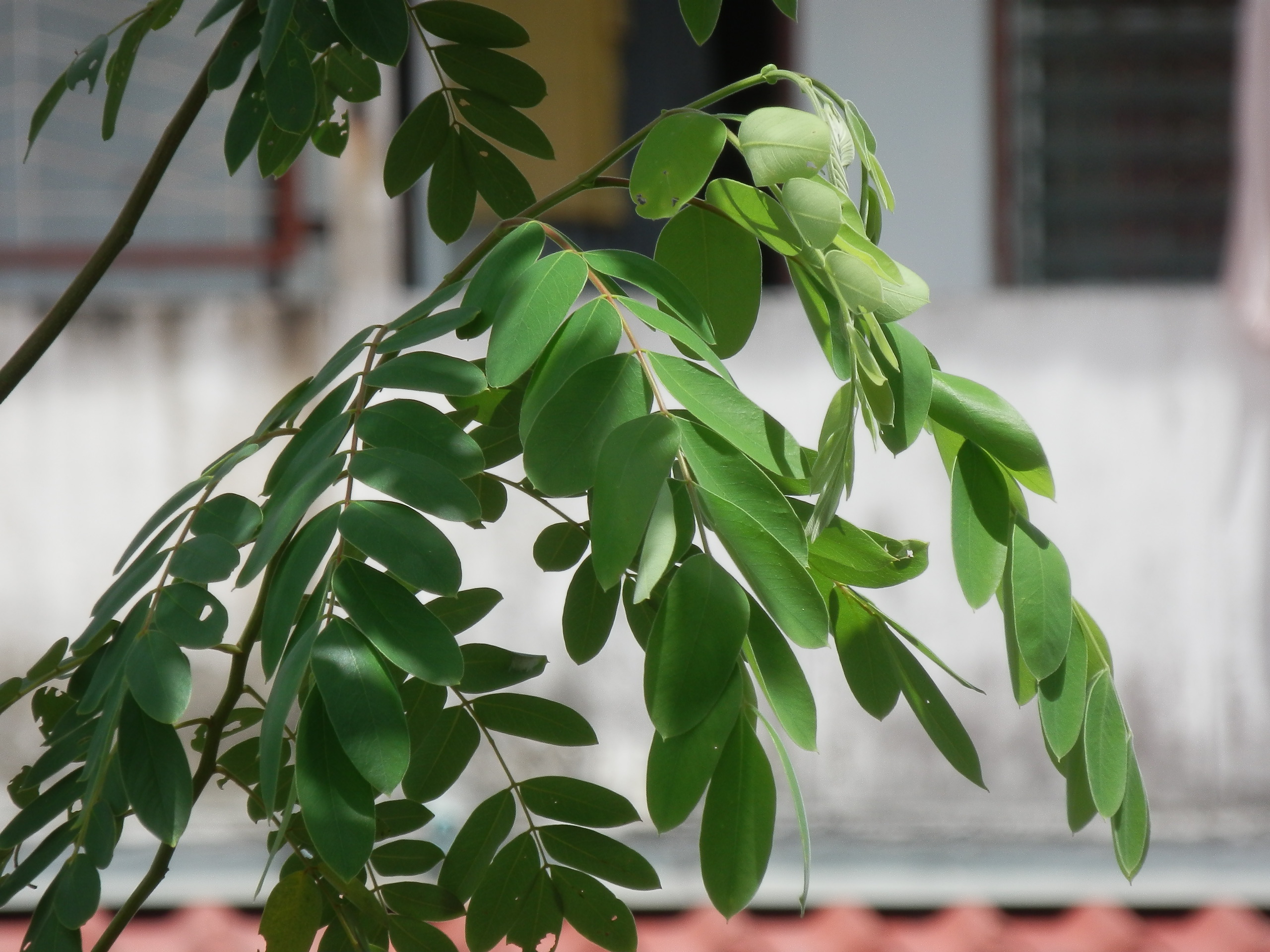 | ลักษณะใบ | ใบมีขนาดเล็กลักษณะคล้ายใบแคฝรั่งหรือใบขี้เหล็ก โดยเป็นใบประกอบแบบขนนกปลายคู่ เรียงสลับ แกนกลางใบประกอบยาวได้ประมาณ 15 - 30 เซนติเมตร มีใบย่อยประมาณ 10 - 20 คู่ เรียงจากเล็กไปหาใหญ่ ลักษณะของใบย่อยเป็นรูปรีแกมรูปขอบขนาน ปลายใบมนมีติ่งหรือหยักเว้าเล็กน้อย โคนใบเบี้ยว แผ่นใบบางเรียบ แผ่นใบด้านบนเกลี้ยงเป็นมันหรือมีขนประปราย ส่วนด้านล่างมีขนขึ้นหนาแน่น ใบอ่อนหรือยอดอ่อนเป็นสีแดง |