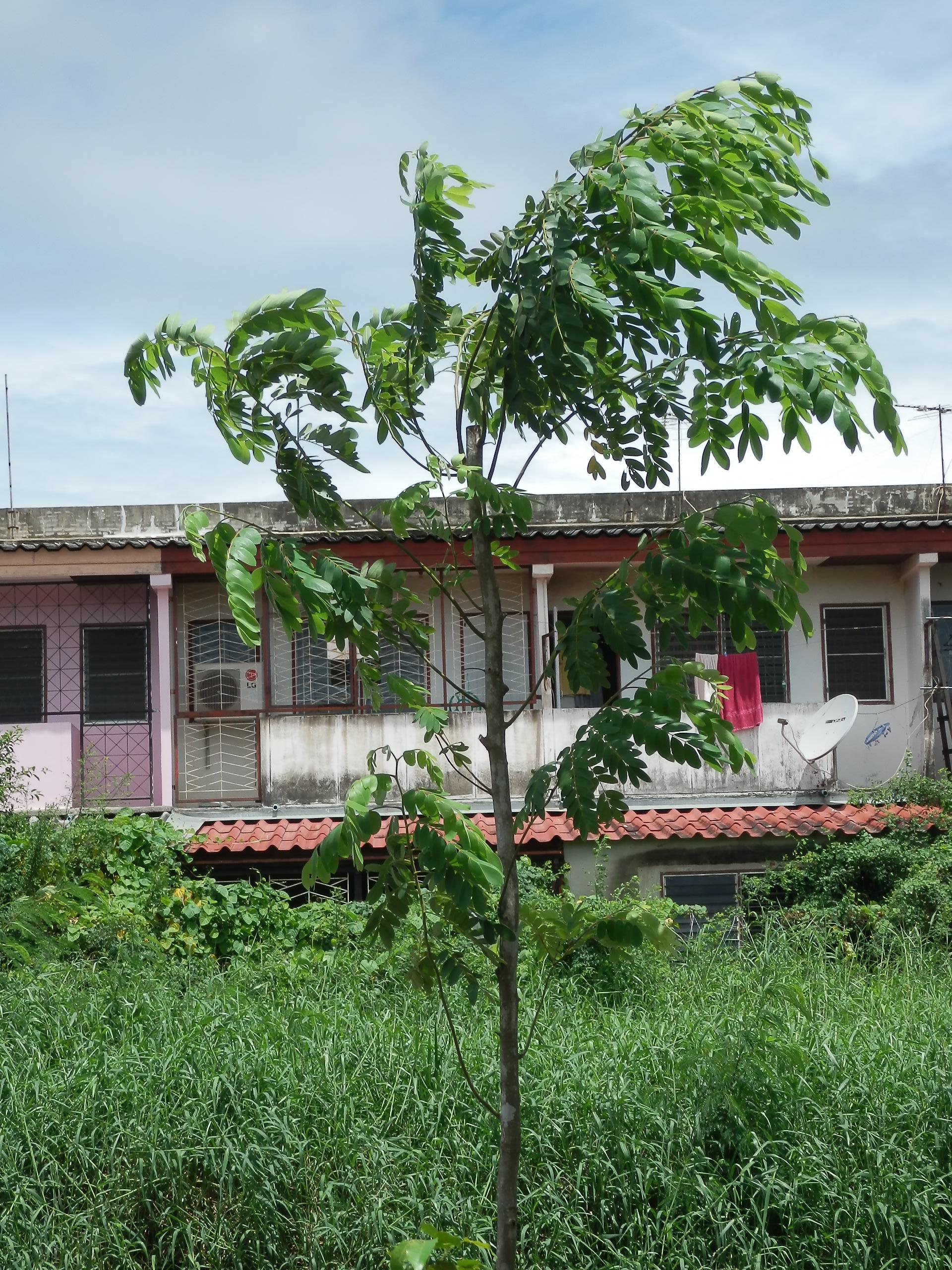 | ลักษณะผล | ผลมีลักษณะเป็นฝักค่อนข้างกลม เป็นแท่งหรือรูปทรงกระบอกยาว โคนและปลายสอบ เปลือกฝักหนาแข็งเป็นสีค่อนข้างดำ ผิวขรุขระ มีรอยแตก ฝักมีขนาดกว้างประมาณ 3 - 4 เซนติเมตร และยาวประมาณ 20 - 40 เซนติเมตร ที่ขอบฝักเป็นสันตามแนวยาวทั้งสองข้าง ผิวฝักมีรอยแตก ฝักแก่จะแห้งแล้วไม่แตก เนื้อในของฝักเป็นสีขาวและแห้ง จะซ้อนกันเป็นชั้น ๆ ภายในฝักมีเมล็ดประมาณ 20 - 40 เมล็ด |