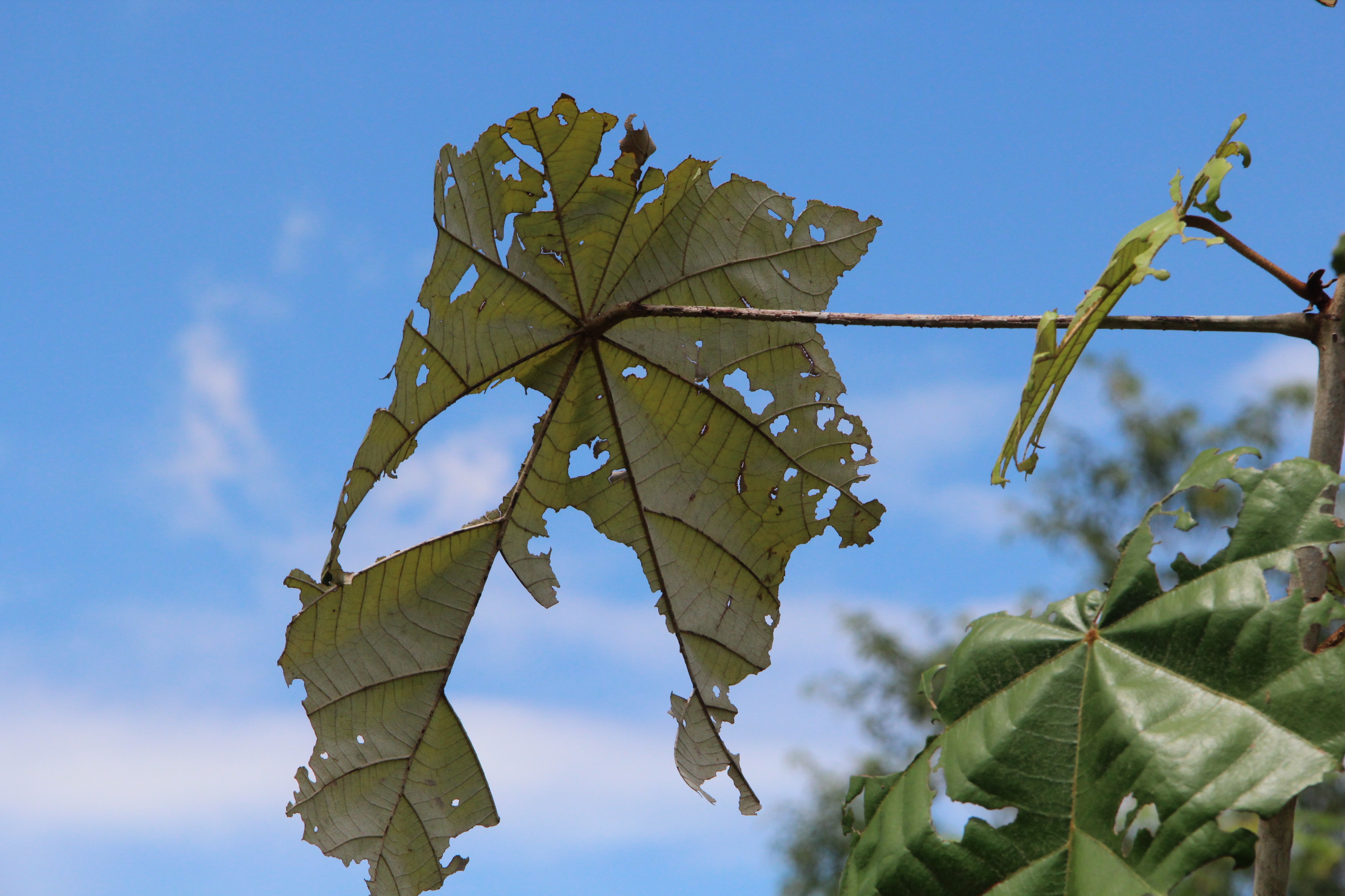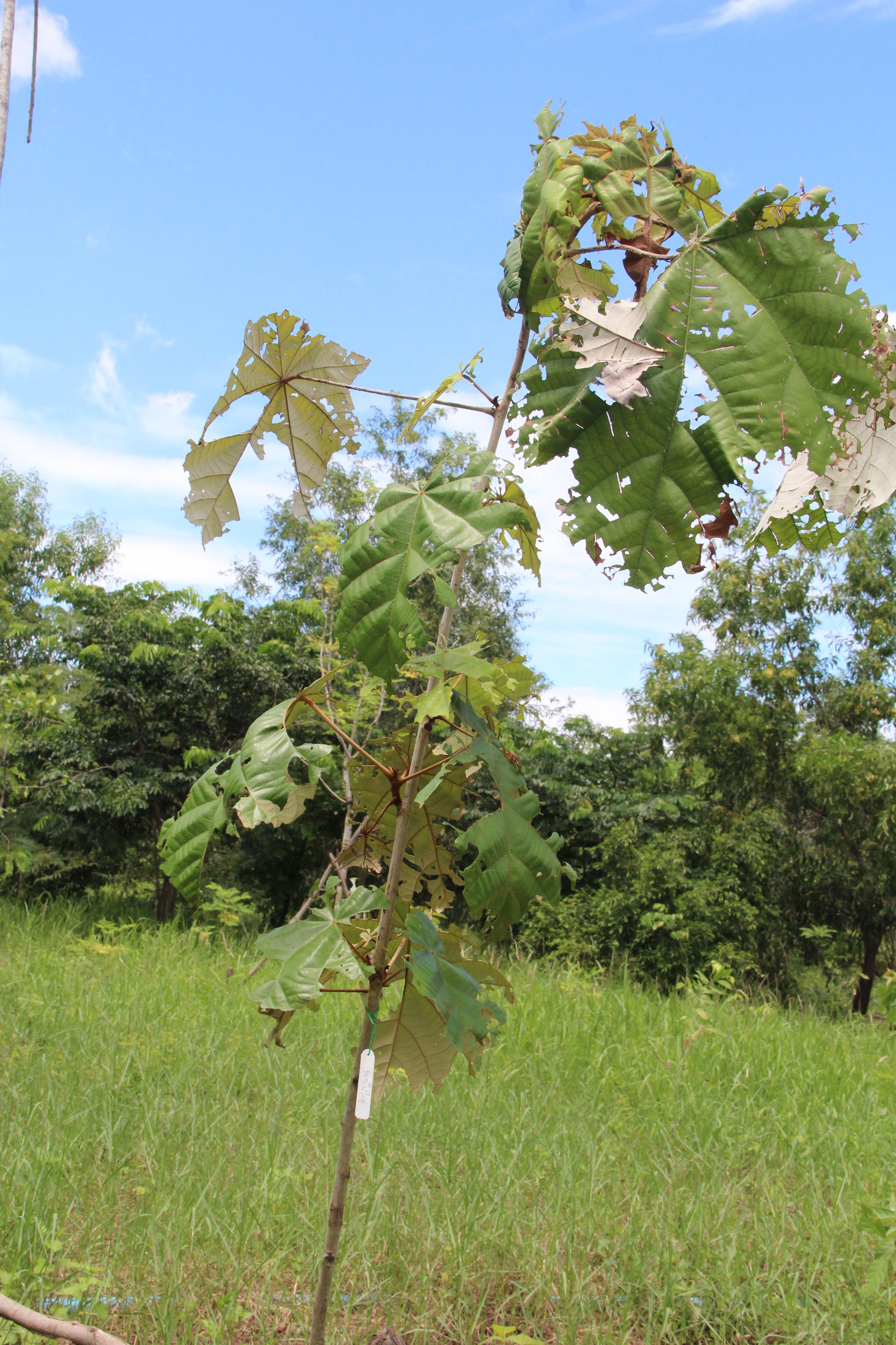 | ลักษณะใบ | ใบเดี่ยวเรียงสลับ รูปทรงไม่แน่นอน ส่วนใหญ่รูปไข่หรือรูปรี ค่อนข้างกว้างจนเกือบเป็นแผ่นกลม ปลายแหลม โคนเว้าลึกคล้ายรูปหัวใจ หรือก้านใบติดกับแผ่นใบล้ำจากโคนใบ ใบของต้นกล้ามีขนาดใหญ่มาก แผ่นใบด้านบนสีเขียวเข้มเป็นมัน ค่อนข้างเกลี้ยง ด้านล่างมีขนสีเทาเป็นกระจุกหนาแน่น และมีเส้นร่างแหปรากฎชัด |