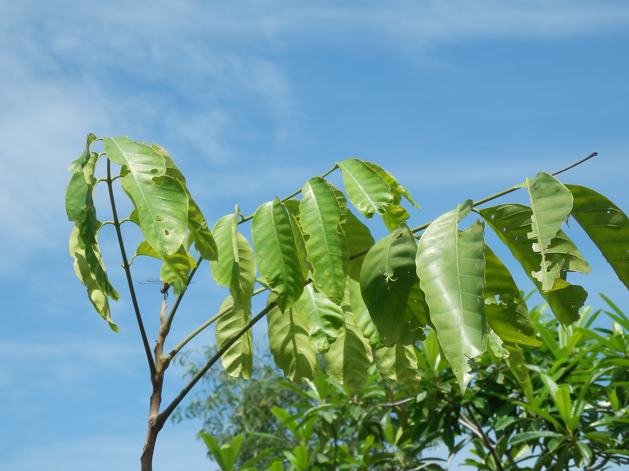 | ลักษณะใบ | ใบประกอบแบบขนนกปลายใบคี่ ออกเรียงสลับกัน มีใบย่อยประมาณ 3 - 7 คู่ ลักษณะของใบย่อยเป็นรูปรีแกมขอบขนาน ปลายใบแหลม โคนใบกลมเบี้ยว ส่วนขอบใบเรียบเป็นคลื่น ๆ แผ่นใบเรียบเกลี้ยงเป็นสีเขียวเข้ม |