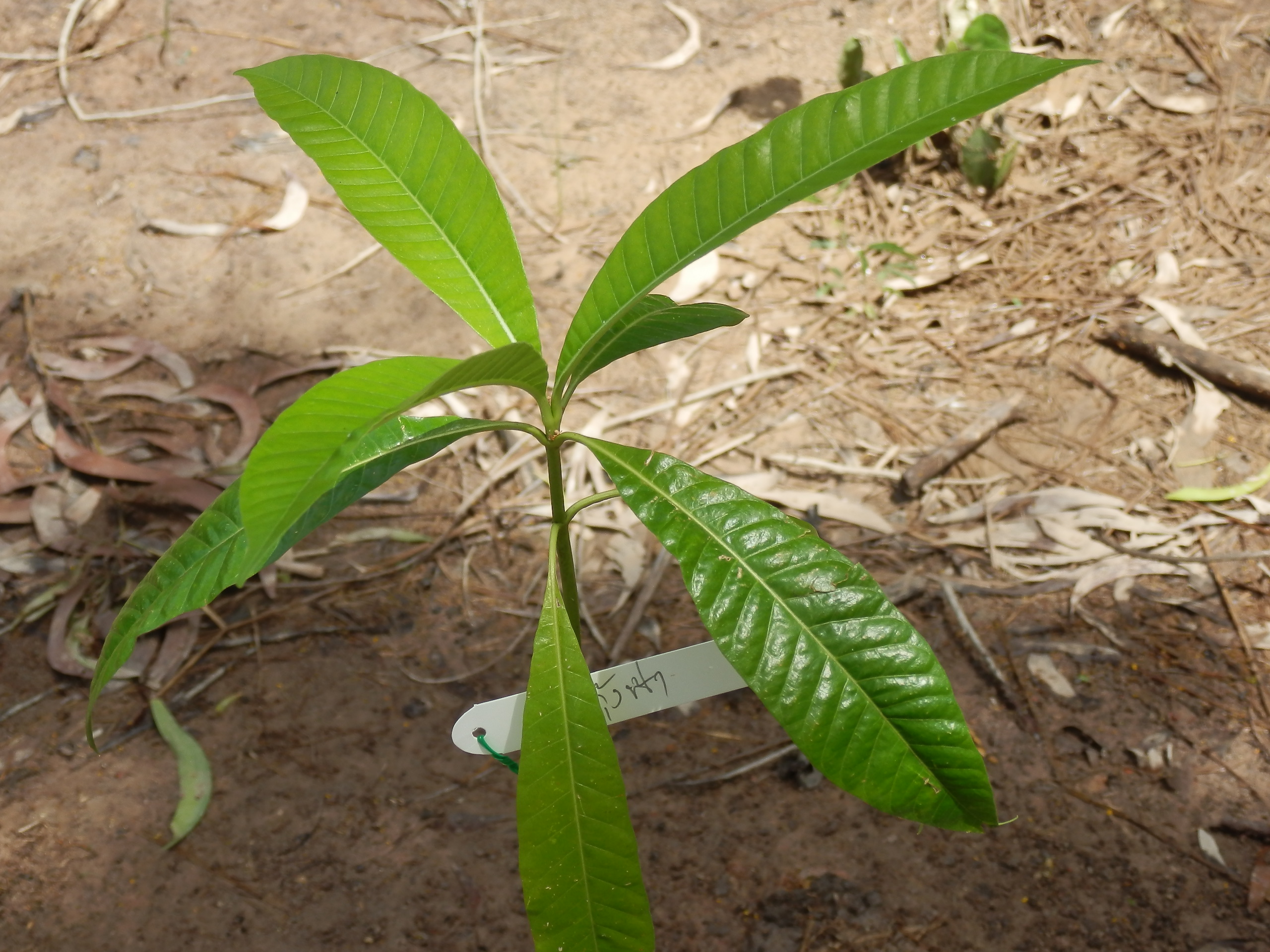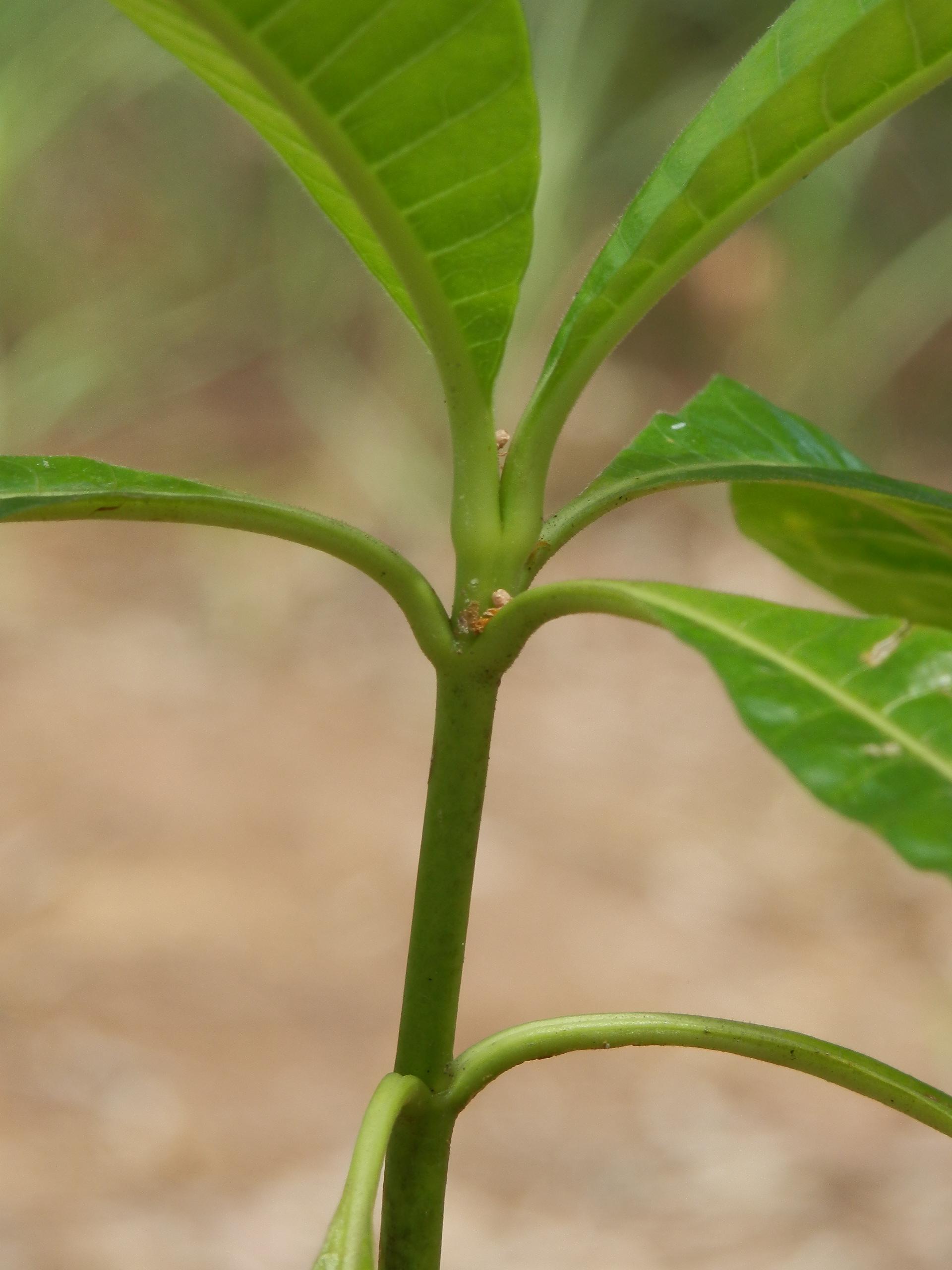 | ลักษณะใบ | เป็นใบเดี่ยว ออกเรียงรอบ ๆ ข้อ ข้อละ 3 - 4 ใบ ก้านใบยาวเล็กน้อย ปลายใบแหลม รูปทรงใบรี ตรงโคนใบจะสอบเข้าหาก้านใบทั้งสองข้าง ส่วนขอบใบเรียบ หลังใบเป็นสีเขียว ท้องใบเป็นคราบสีขาว เส้นแขนงใบถี่และเป็นเส้นตรง |