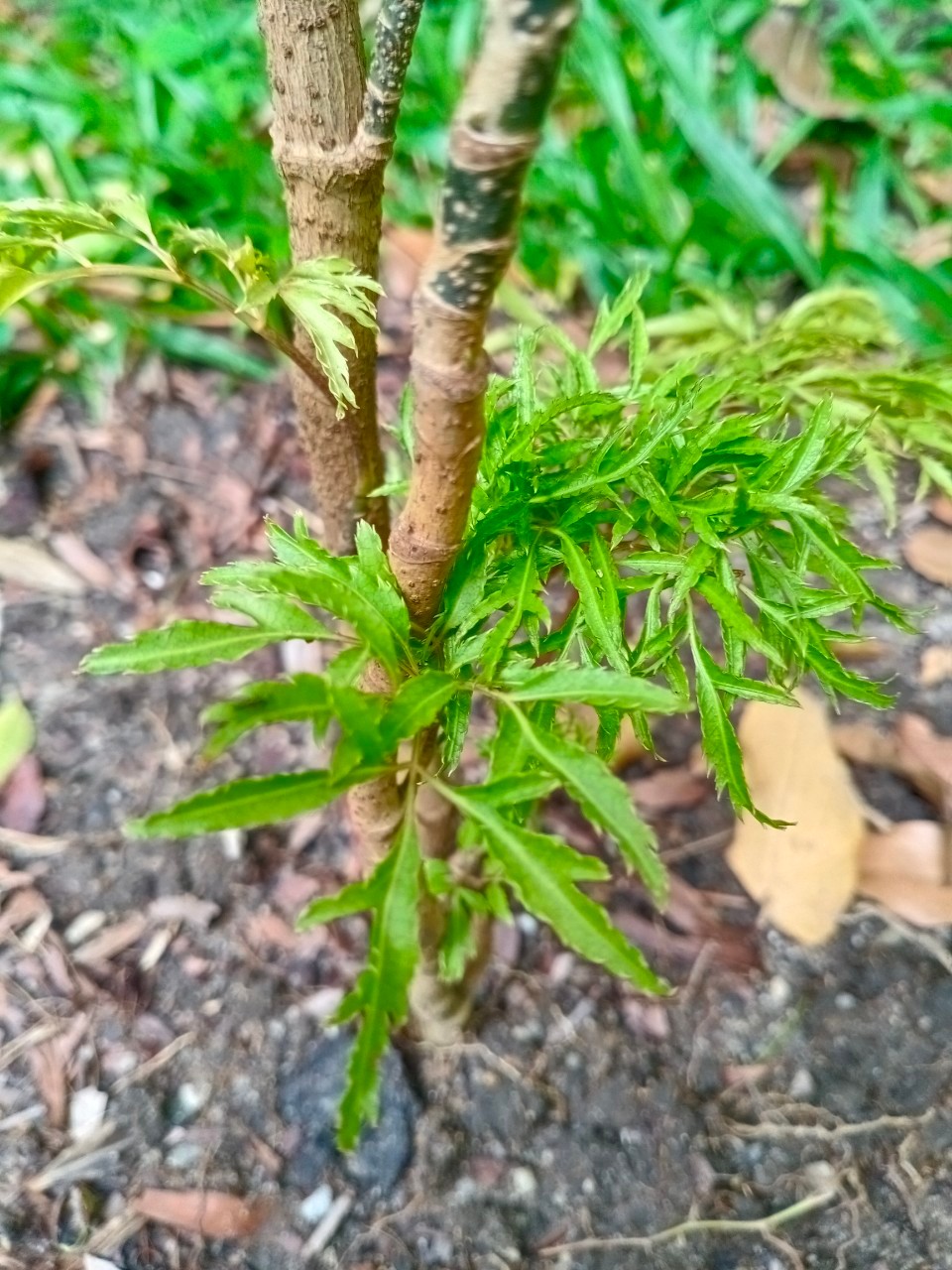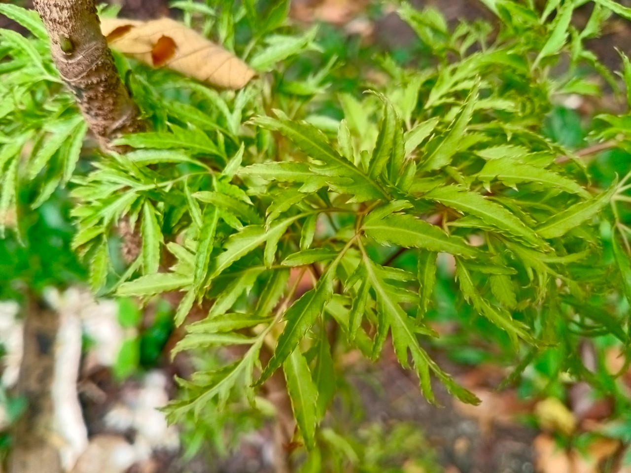 | ลักษณะใบ | ใบประกอบแบบขนนก ใบย่อยขอบเว้าลึก ขอบใบจักฟันเลื่อยปลายแหลม ก้านใบส่วนที่ติดกับลำต้นเป็นกาบ ใบเมื่อขยี้ดมจะให้กลิ่นน้ำมันหอมระเหย |