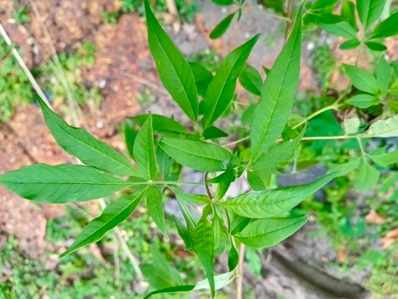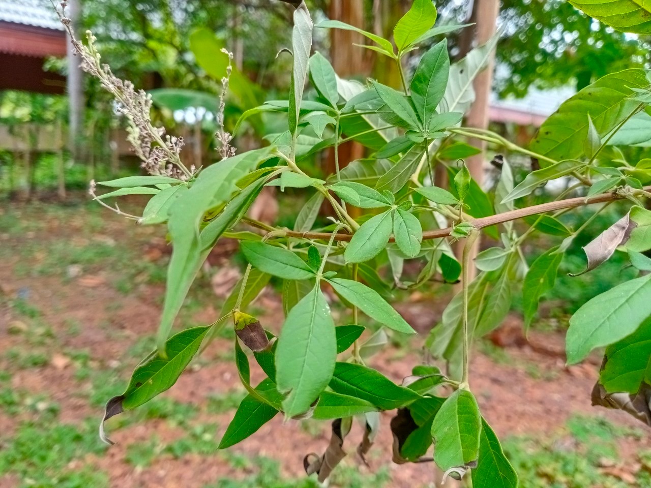 | ลักษณะใบ | เป็นใบประกอบแบบนิ้วมือ เรียงตรงกันข้าม มีใบย่อย 5 ใบ ใบคล้ายรูปหอกหรือรูปไข่ หรือรูปขอบขนานแกมรูปใบหอก ขอบใบเรียบหรือหยักเล็กน้อย ปลายใบยาวแหลม หลังใบสีเขียวเข้ม ท้องใบมีสีขาว และมีขนอ่อนปกคลุม |