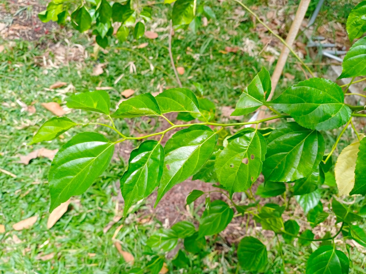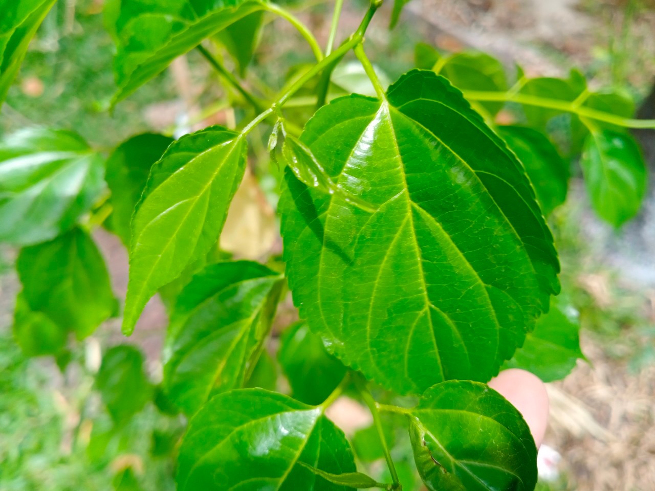 | ลักษณะใบ | เป็นใบเดี่ยวเรียงตัวแบบสลับ รูปใบแบบไข่หรือรี ปลายใบแหลม ฐานใบกว้างรูปหัวใจ ขอบใบหยัก ผิวใบสากเนื้อใบหนาและเหนียว |